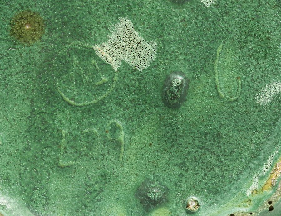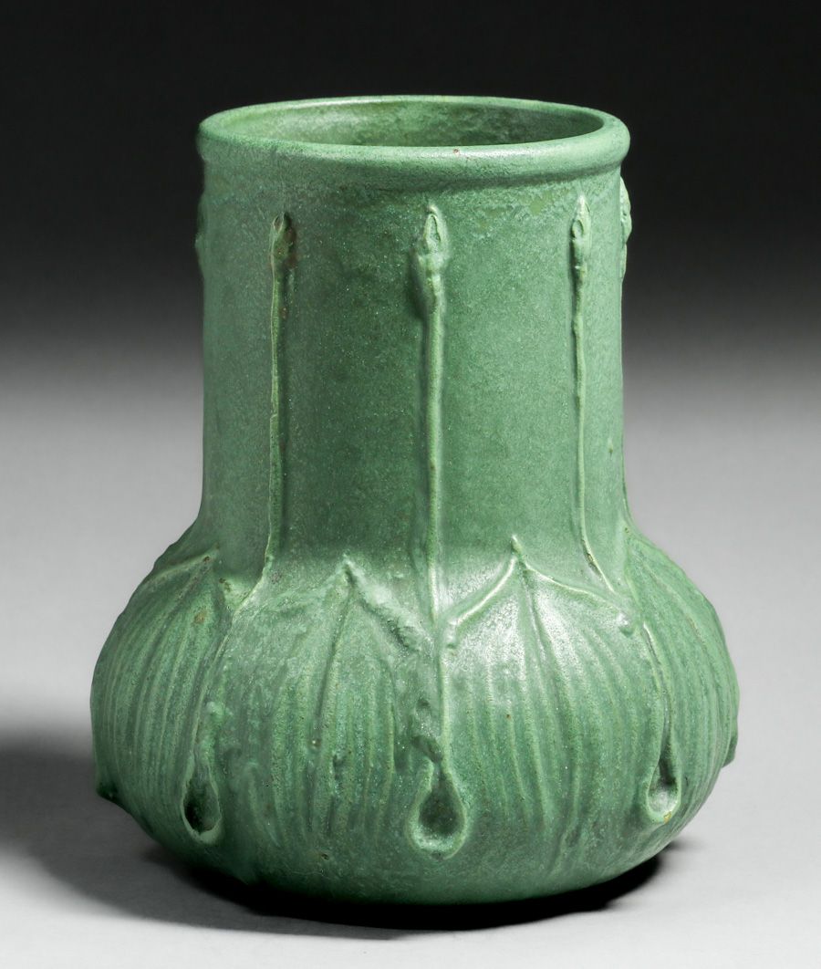 Wheatley Pottery Matte Green Leaves & Buds Vase c1910. Signed. A few glaze bubbles, otherwise perfect condition. 9 1/8″h x 7″d SOLD