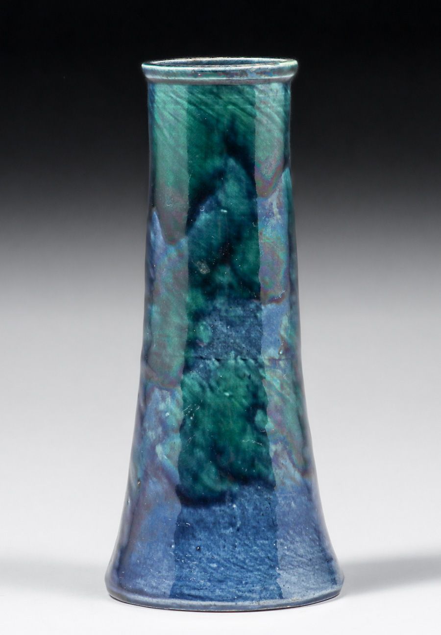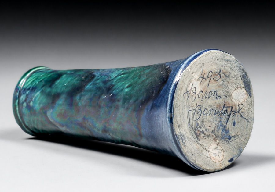 William Baron Barnstaple #493 Devon Art Pottery Iridescent Vase c1900s. Signed. Perfect condition. 7.5"h x 3.25"d SOLD