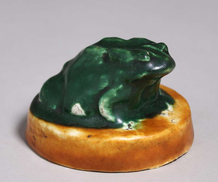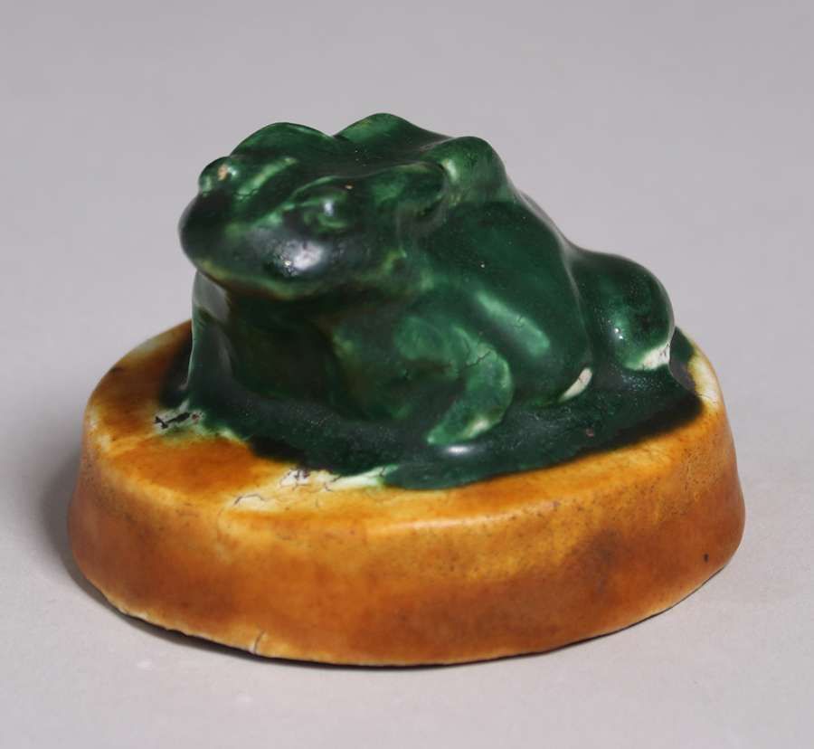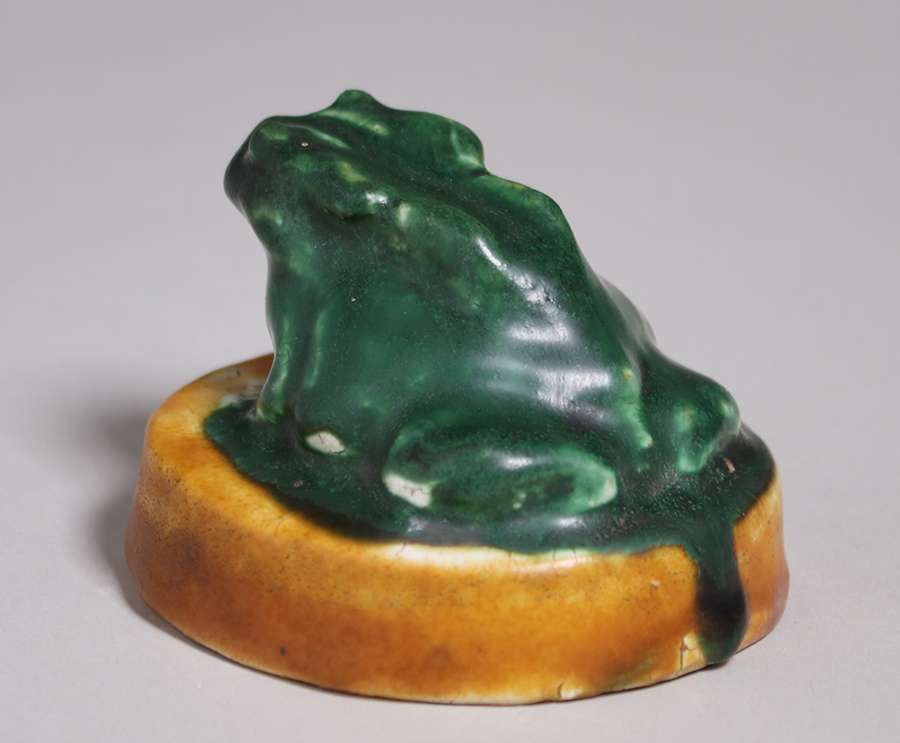 Zanesville pottery frog paperweight c1910. Unsigned. Perfect condition. 2″h x 3″d SOLD