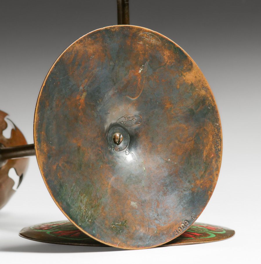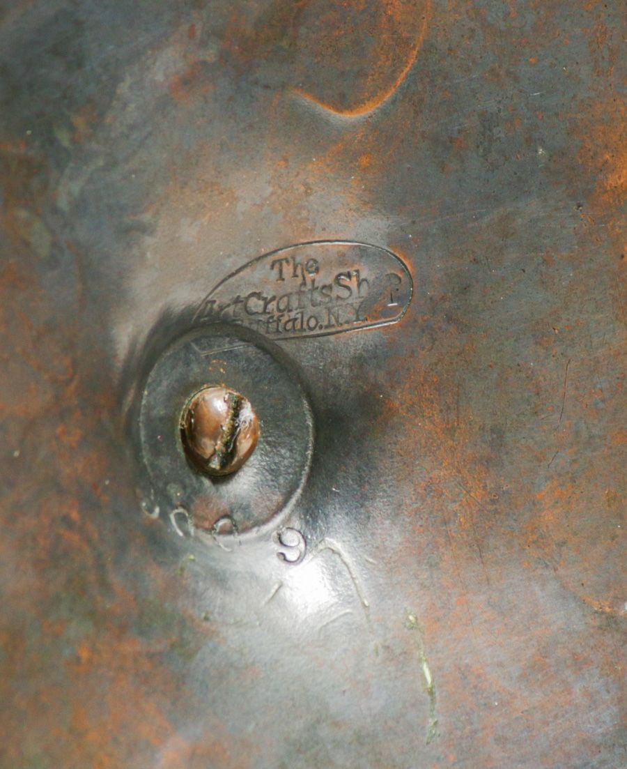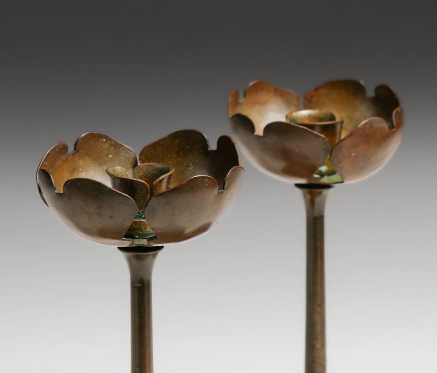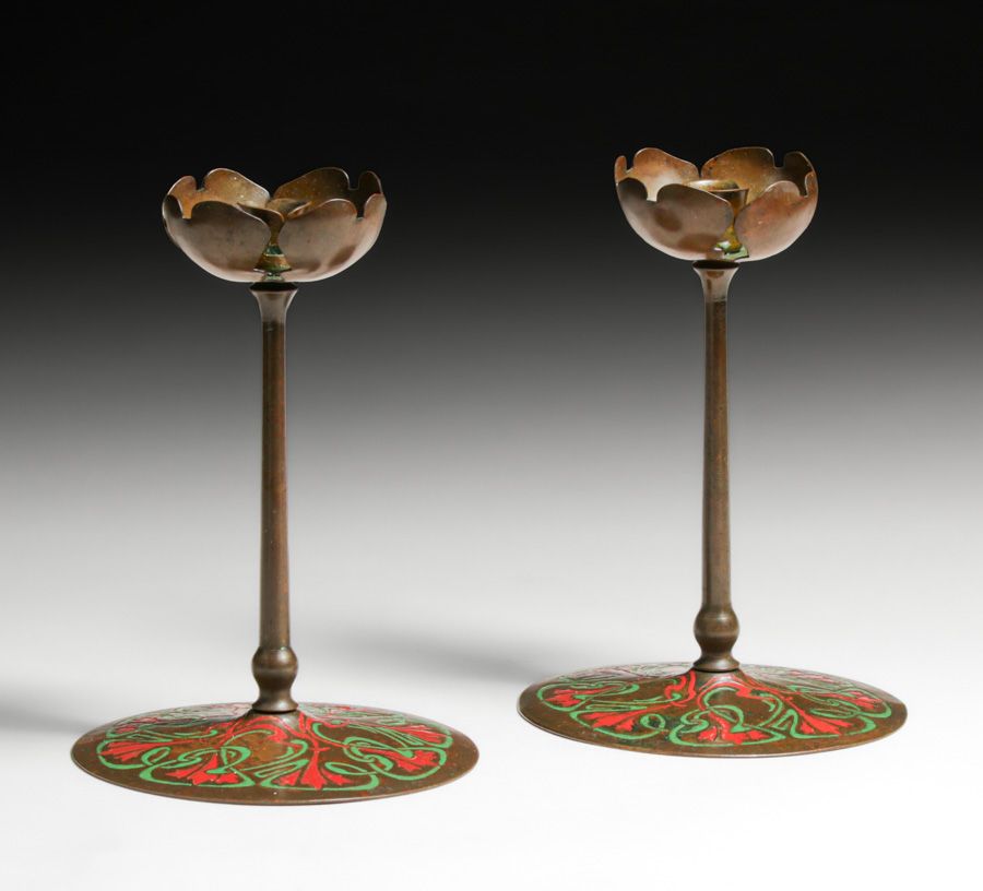 Pair Art Crafts Shop – Buffalo, NY Enamel Candlesticks c1905. Signed. Excellent original enamel and original patina. 8.25"h x 6"d