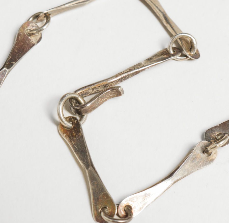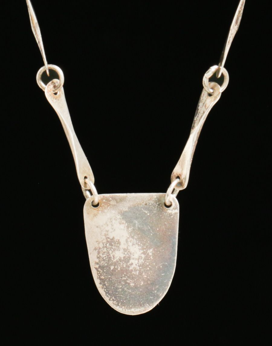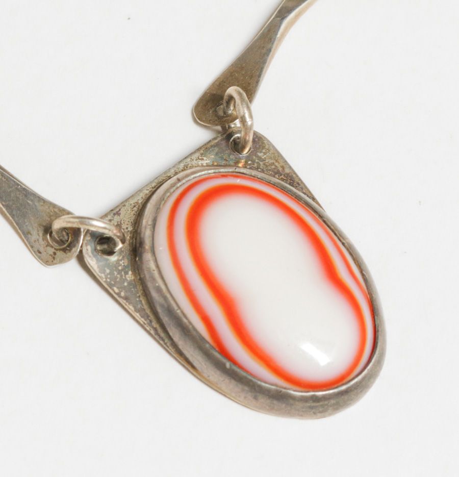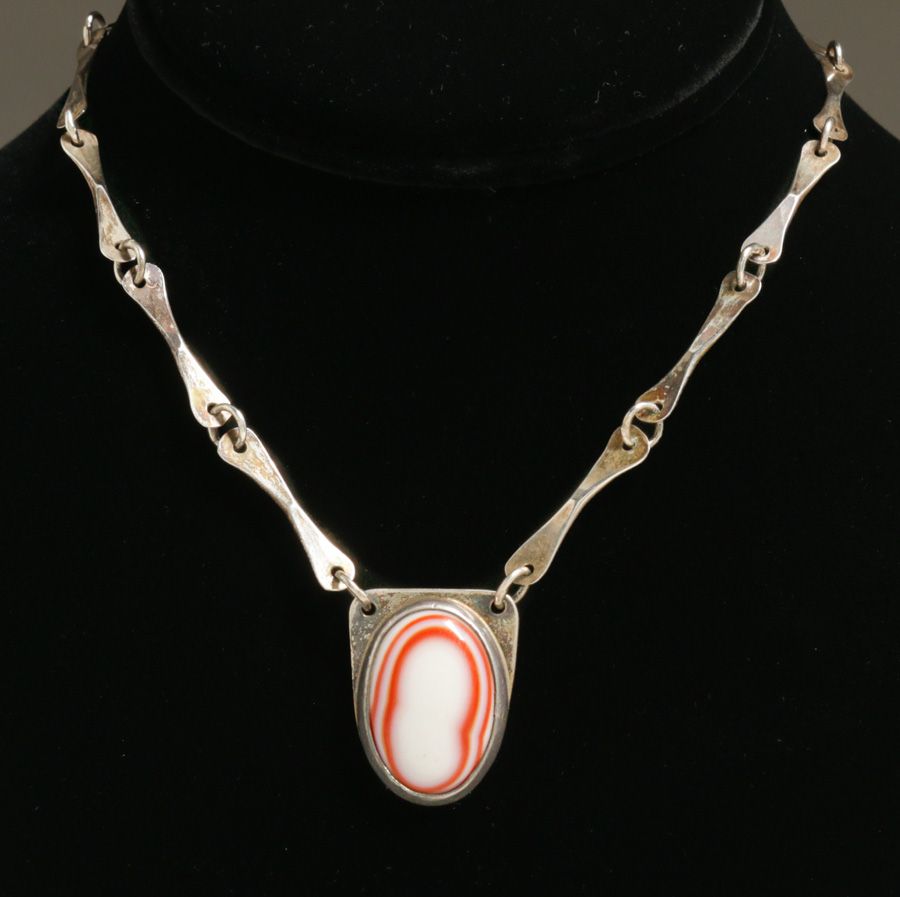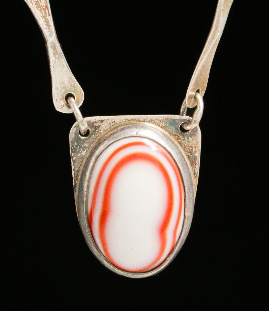Arts & Crafts Period Sterling Silver & Carnelian Striped Agate Pendant Necklace c1920s. Unsigned. 14.5" length + 1" pendant