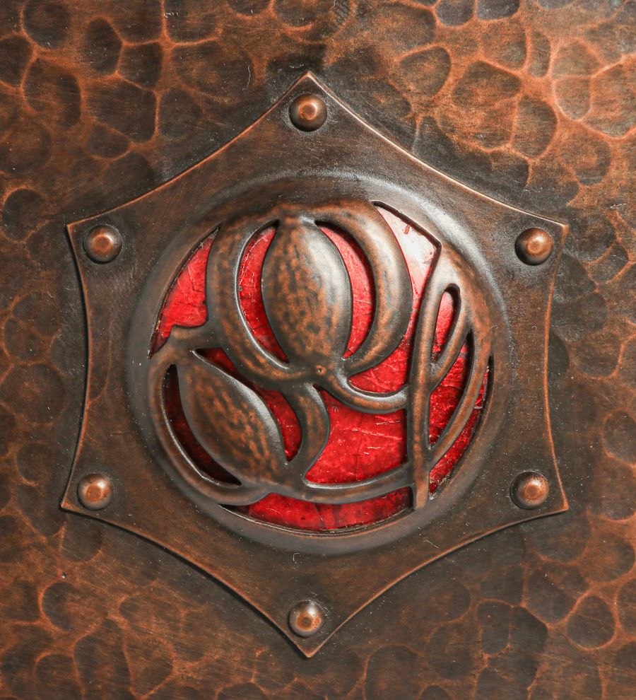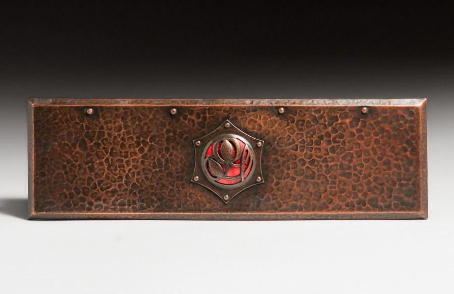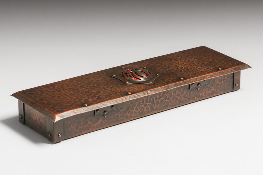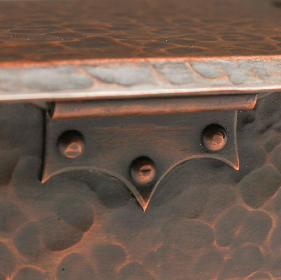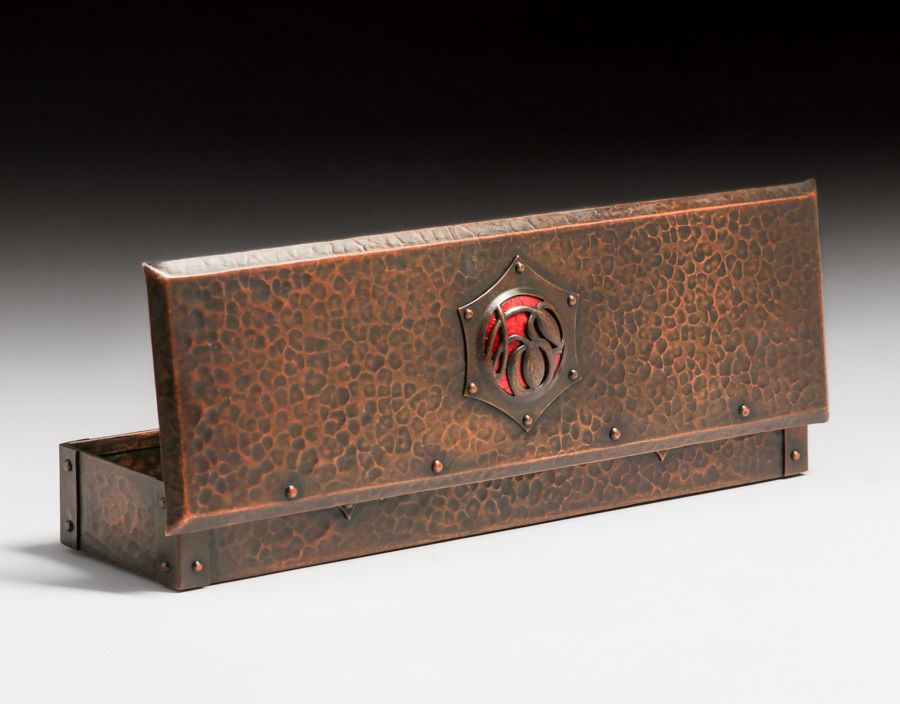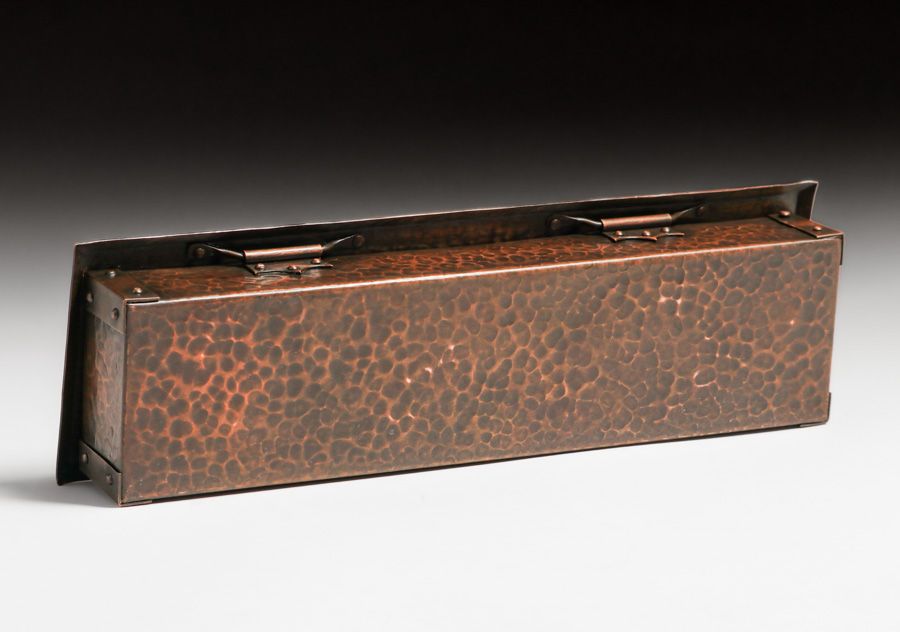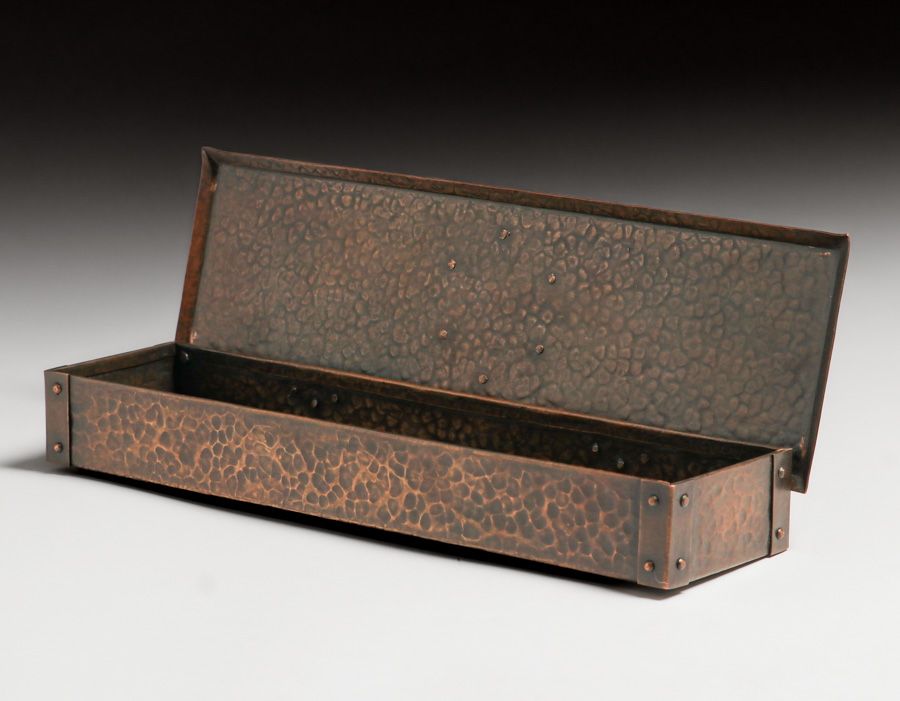 English Arts & Crafts Hammered Copper & Enamel Box c1900s. Unsigned. Excellent new patina. 13"w x 3 7/8" x 2"h