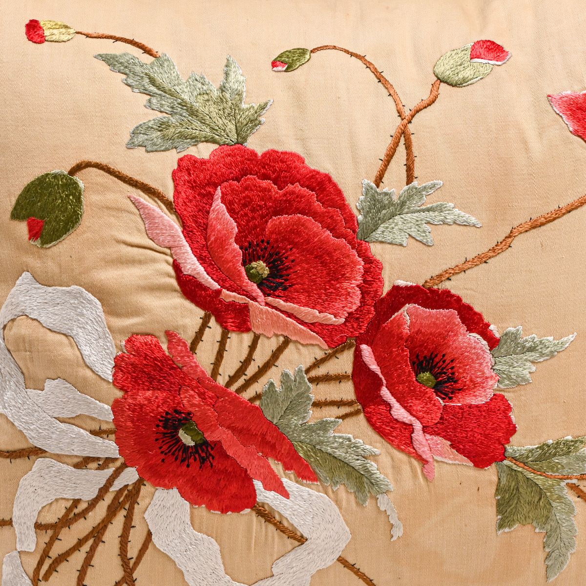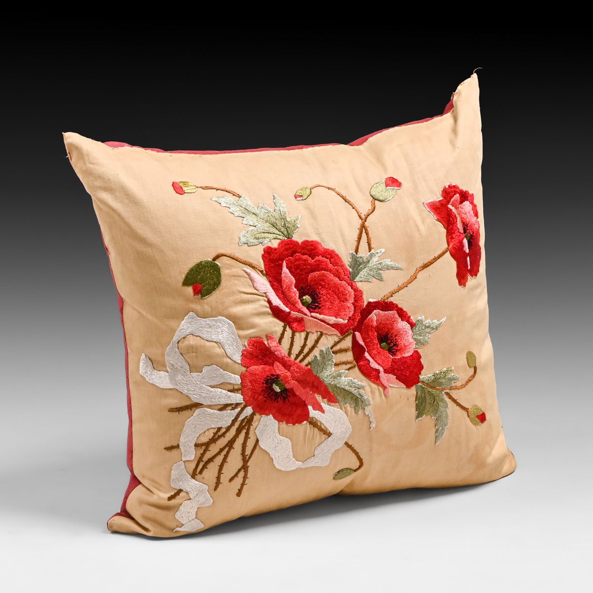 - Arts & Crafts Period Hand-Embroidered Silk Rose Pillow c1910