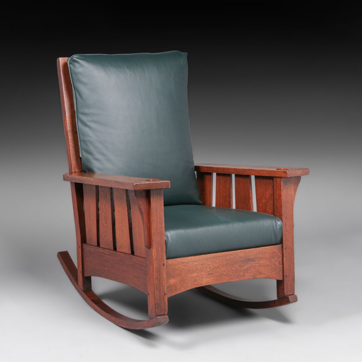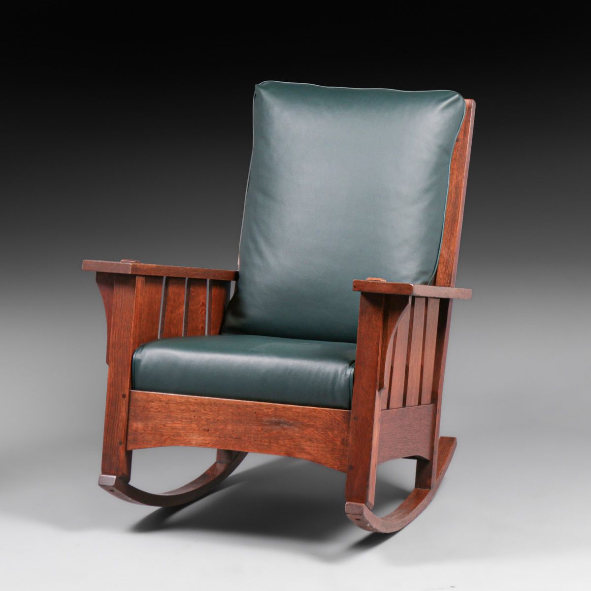 Arts & Crafts Period Oak Slatted Rocker c1910. Unsigned. Excellent original finish. 43"h x 32.5"w x 38"d