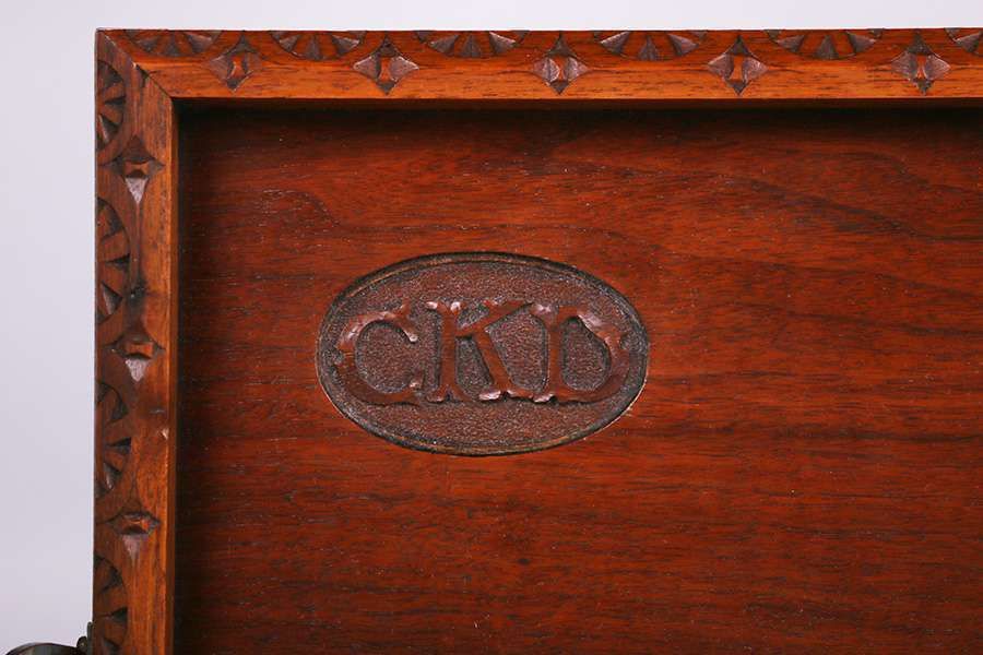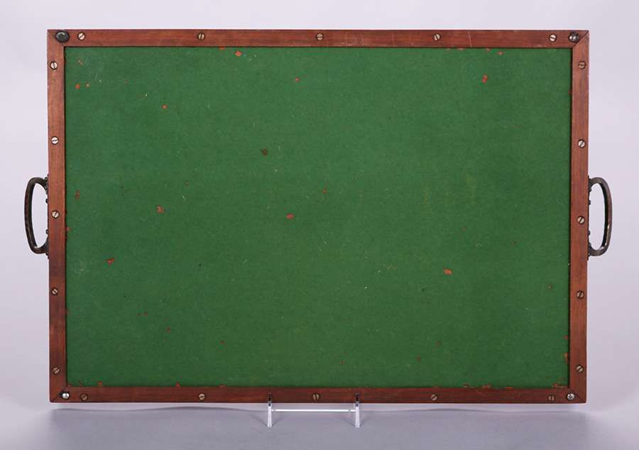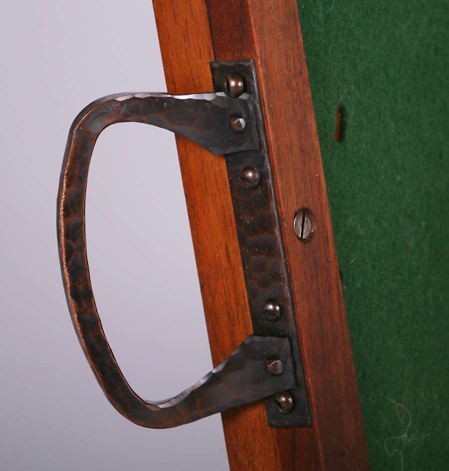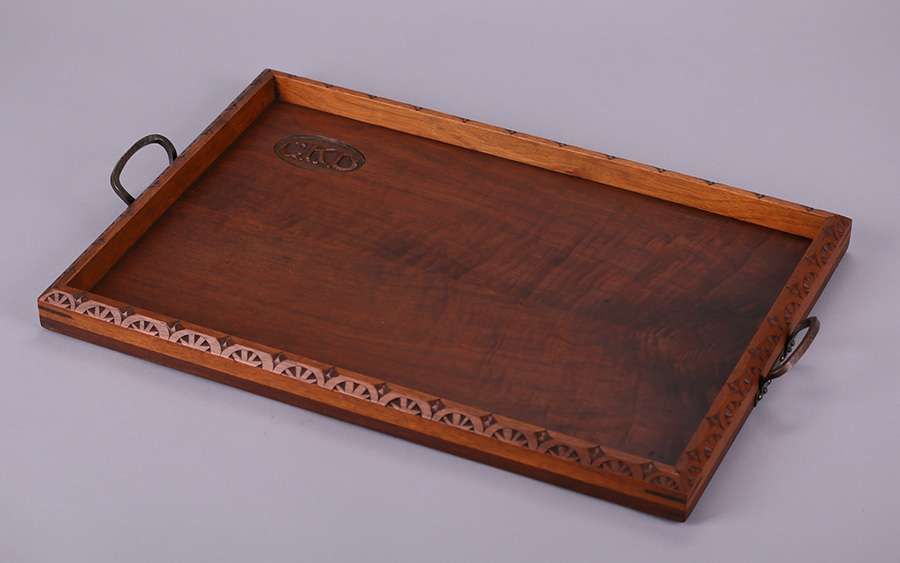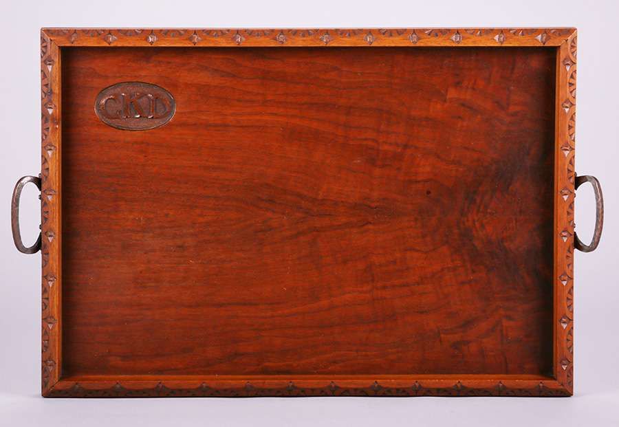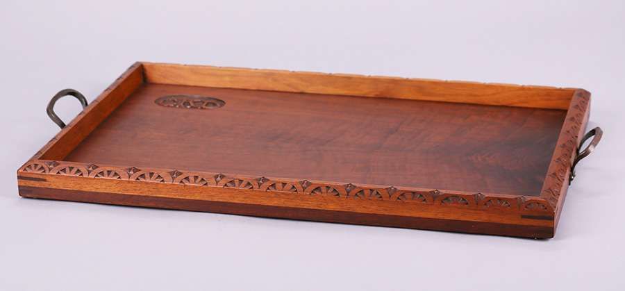 Biltmore Industries - Asheville, NC hand-carved mahogany tray with two hammered copper handles. Unsigned. Excellent original finish and original patina. 25"w x 15.75" SOLD
