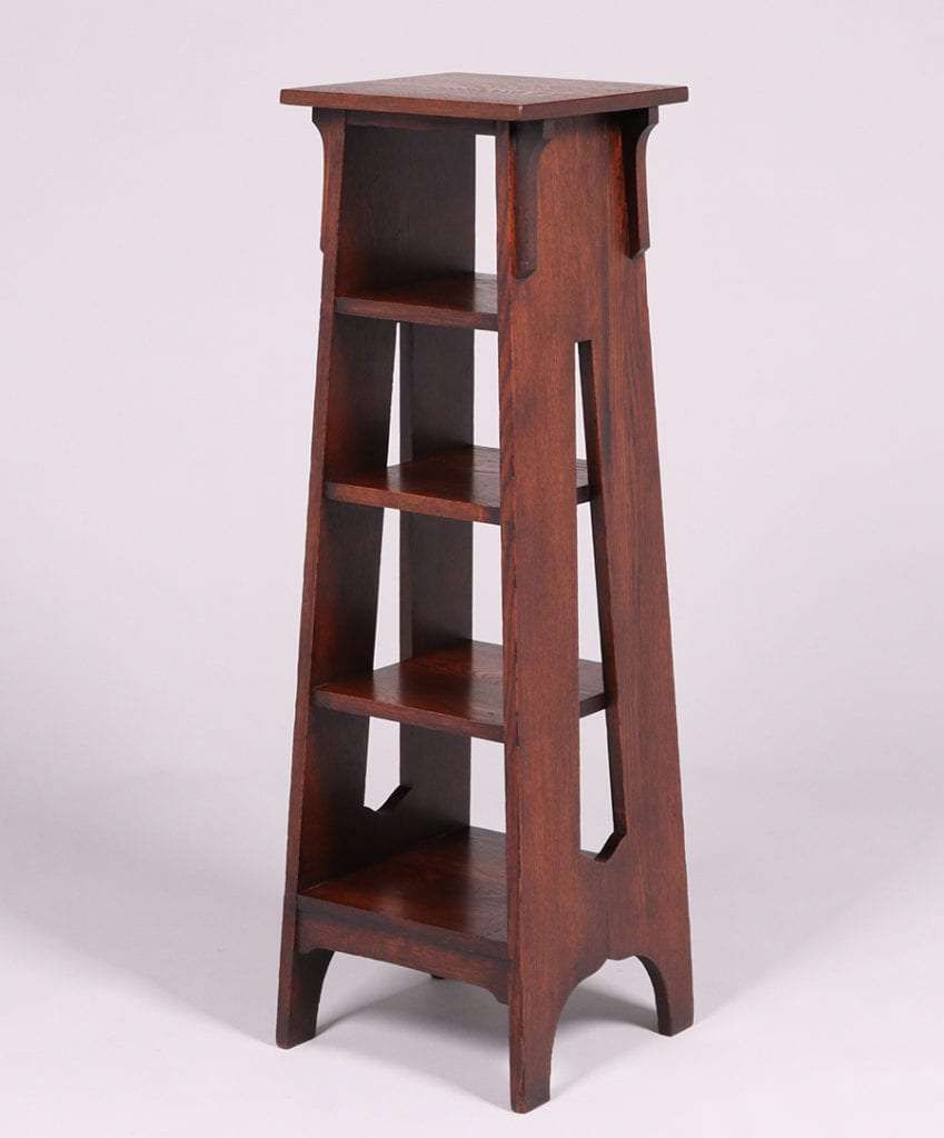 Brooks Furniture Co tall, cutout magazine stand c1910. Unsigned. Top refinished perfectly to match original finish. 44″h x 13″ x 13″ top (14″ x 14″ at base) SOLD