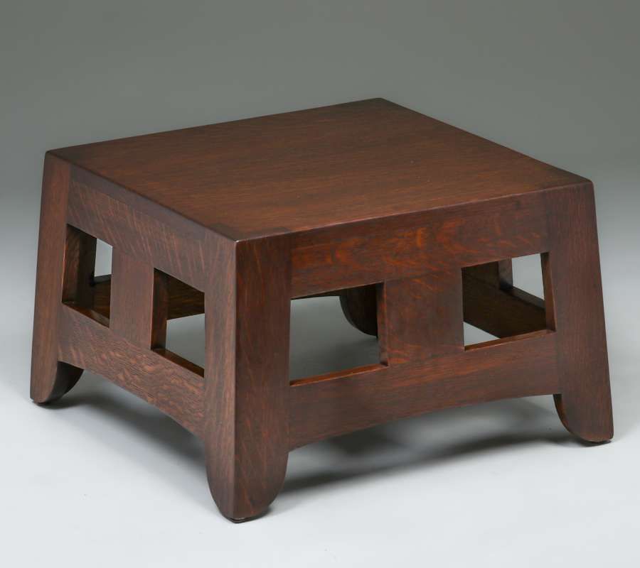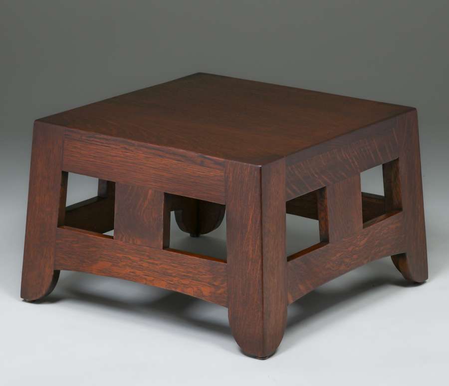 Brooks Furniture Co Cutout Pagoda Base c1910. Originally a taller table. It still makes a very cool pedestal. Unsigned. Very nicely refinished. 19.75"sq x 12.5"h SOLD