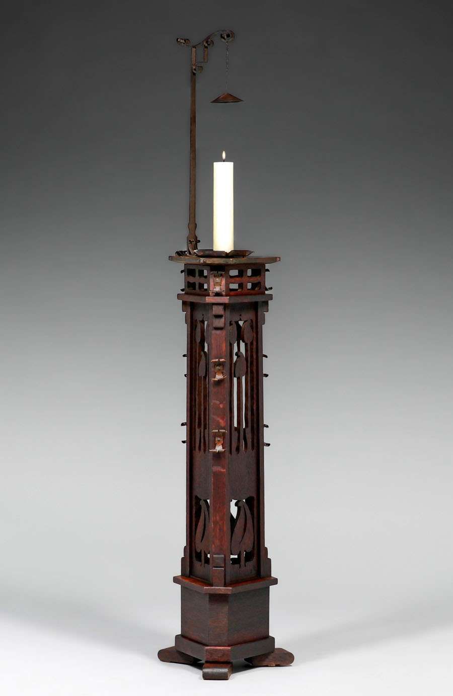 - Charles Rohlfs Hand-Carved Oak & Hammered Copper Tall Pedestal Candle Stand 1906