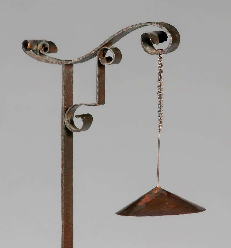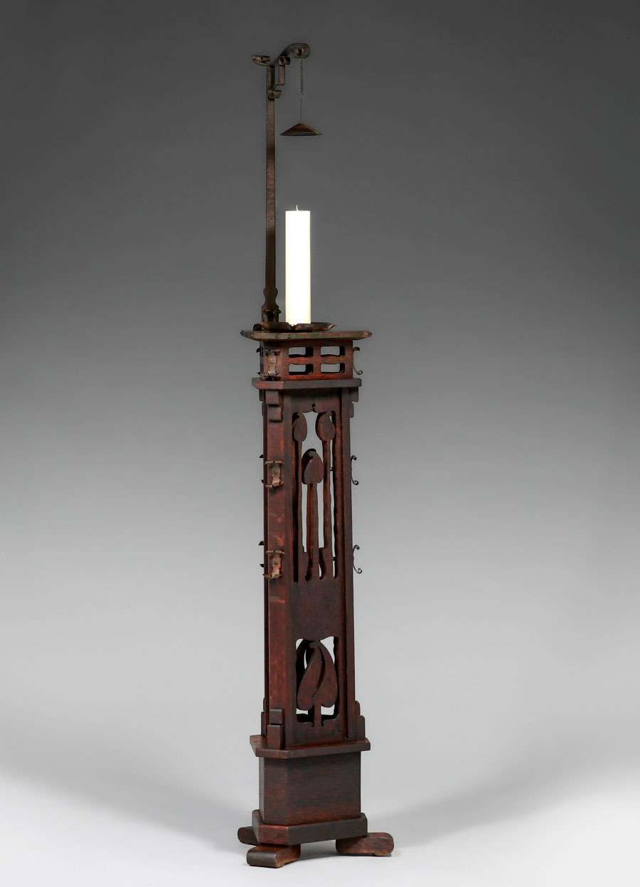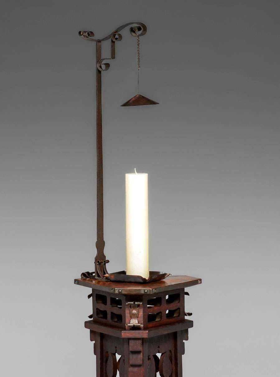 Charles Rohlfs Hand-Carved Oak & Hammered Copper Tall Pedestal Candle Stand 1906. Provenance: Collection of Don Magner. Literature: Drama in Design: The LIfe and Craft of Charles Rohlfs , James, pg. 51 The Artistic Furniture of Charles Rohlfs , Cunningham, pg. 176 Signed. Excellent original finish. 75"h x 16.25"d SOLD