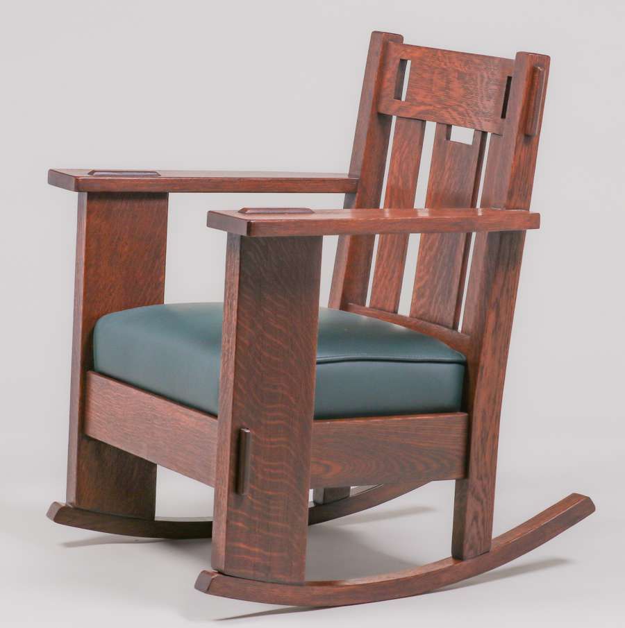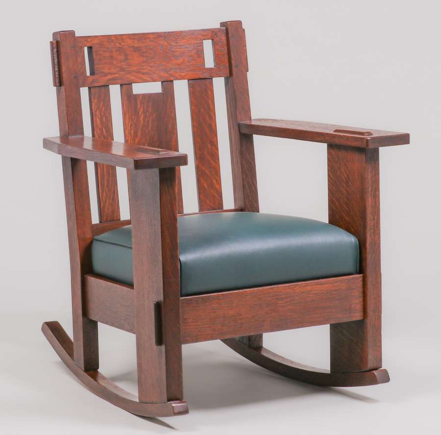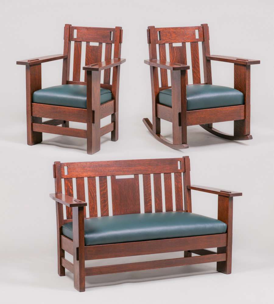Charles Stickley Cutout Bench & Chair Set c1910. Unsigned. Very nicely refinished. Rock solid sturdy. Bench 58.75"w x 26.75"d x 37"h. Armchair 36.75"h x 29.25"w x 22.5"d. Rocker 34.5"h x 29.5"w x 29.75"d SOLD
