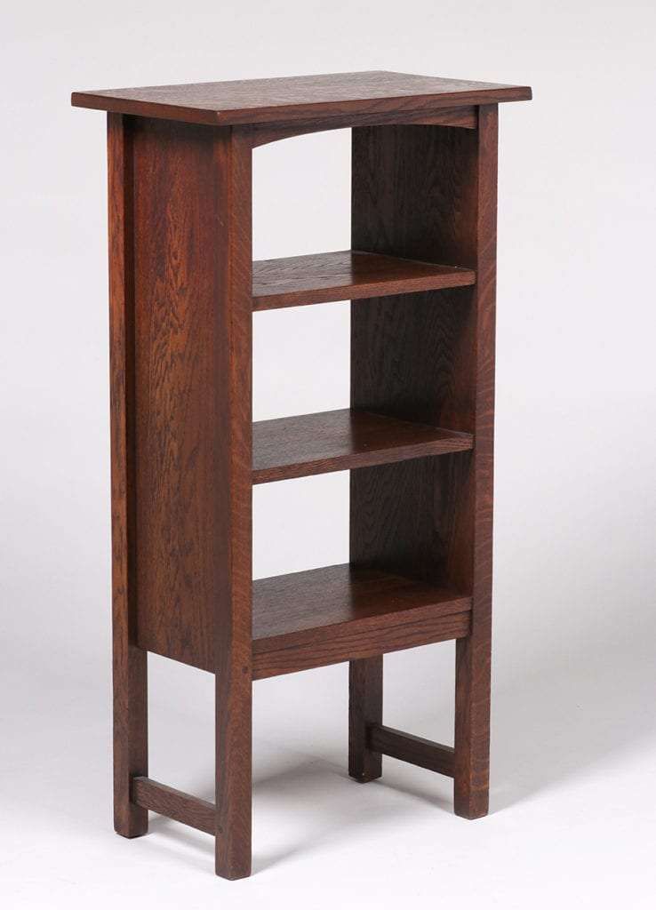Charles Stickley magazine stand c1910. Unsigned. Excellent original finish. 42″h x 22″w x 13″d SOLD