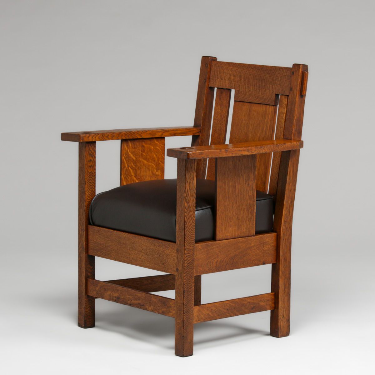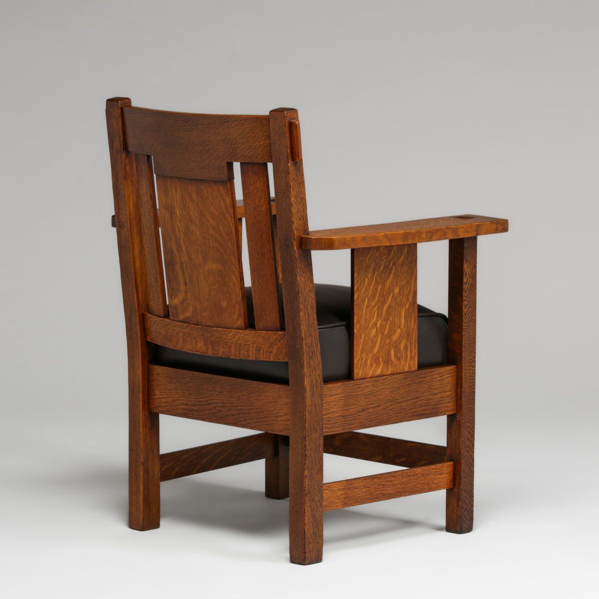Charles Stickley Oak Armchair c1910. Unsigned. Very nicely refinished. Rock solid sturdy. 35.5"h x 27"w x 22"d