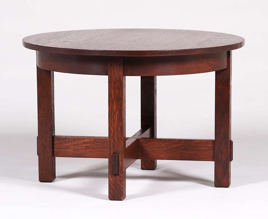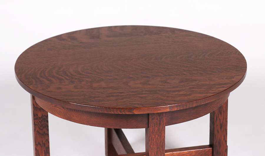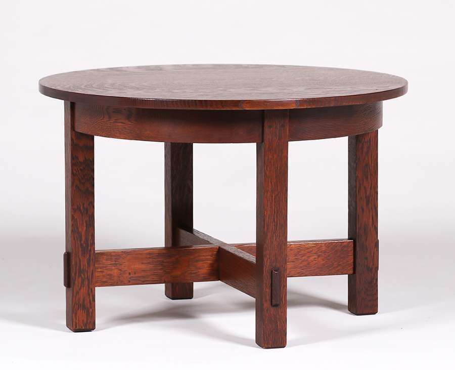 Charles Stickley round side table - coffee table c1910. Unsigned. Very nicely refinished. Cutdown. 26"d x 17.5"h SOLD