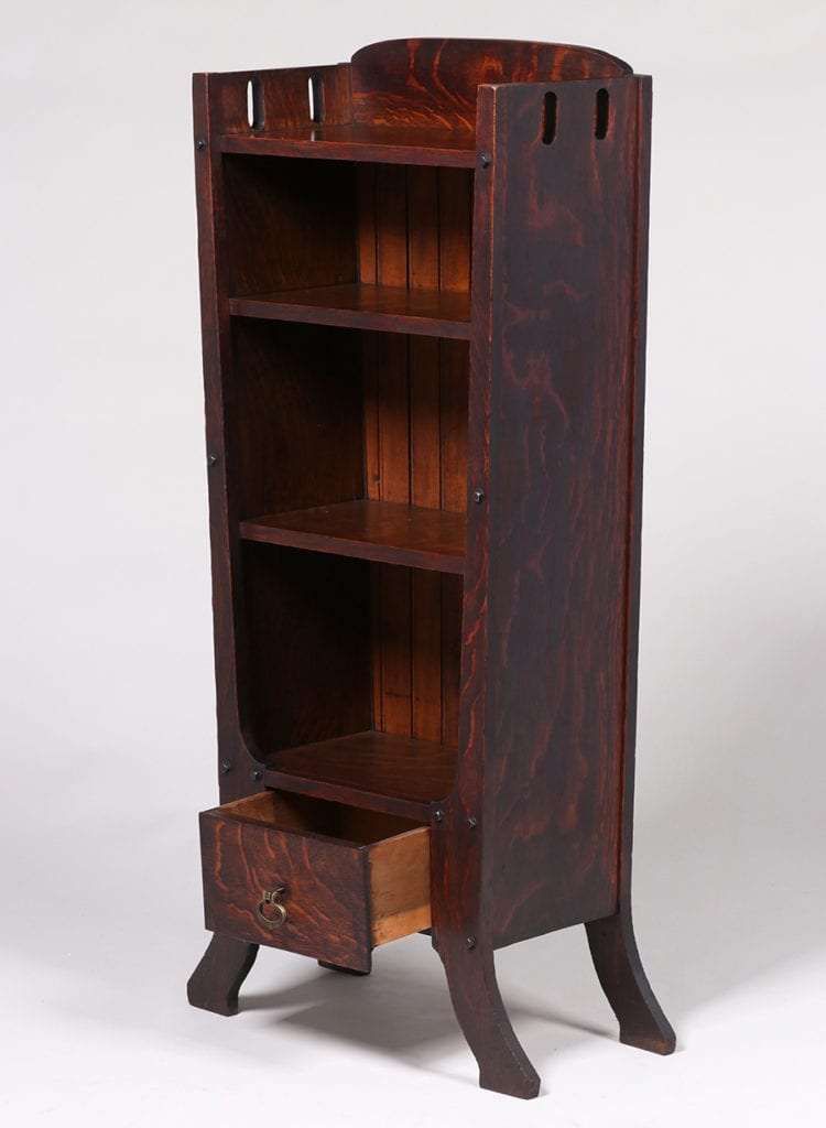 Grand Rapids cutout bookshelf with one lower drawer c1905. Unsigned. Excellent original finish. 48"h x 19.75"w x 10.5"d SOLD