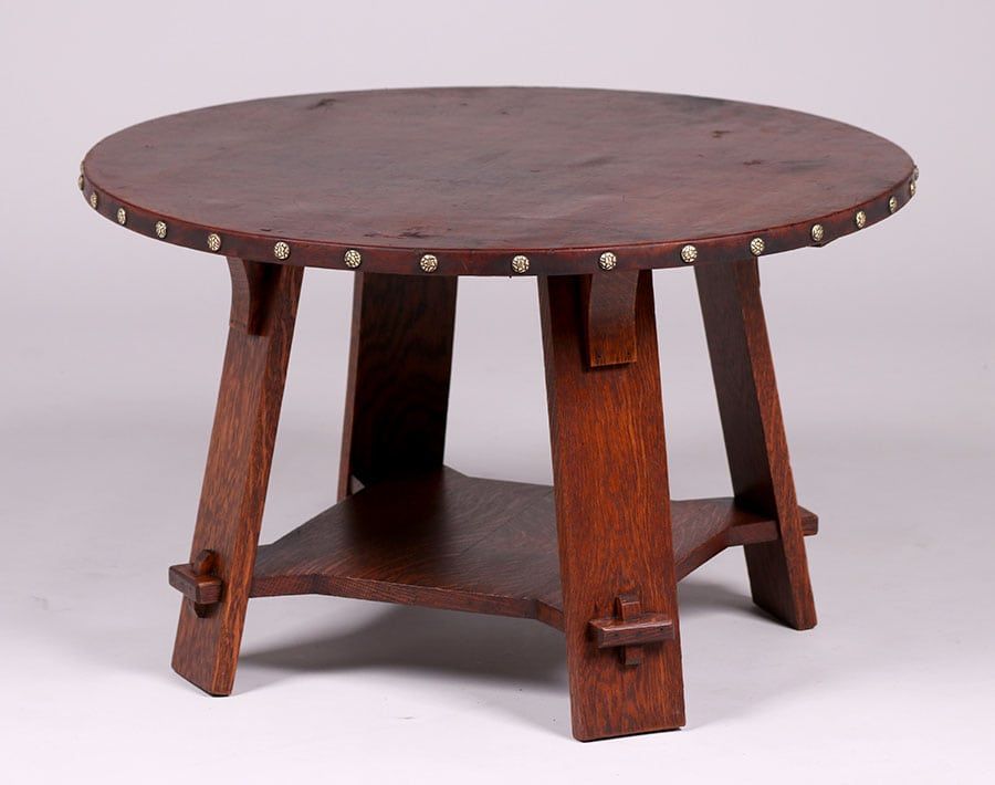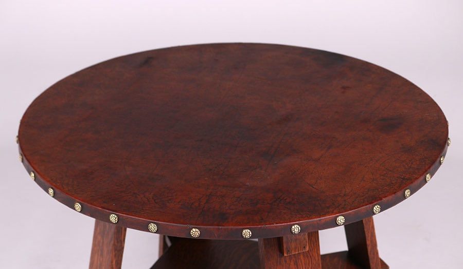 Grand Rapids leather-top coffee table c1905. Unsigned. Old refinish looks like original finish. Original leather top. Probably a taller table originally. 28"d x 17.25"h SOLD