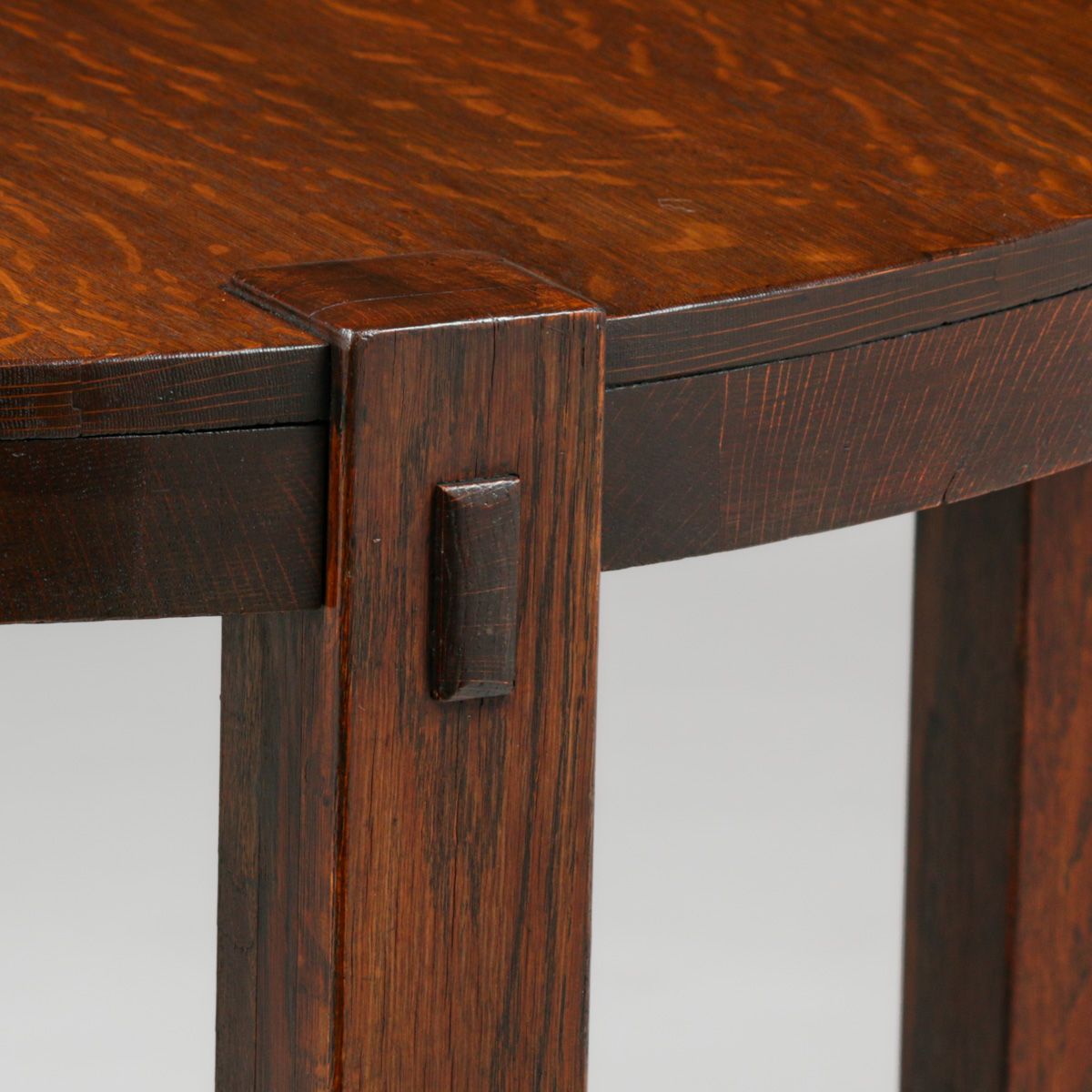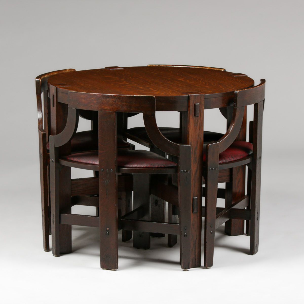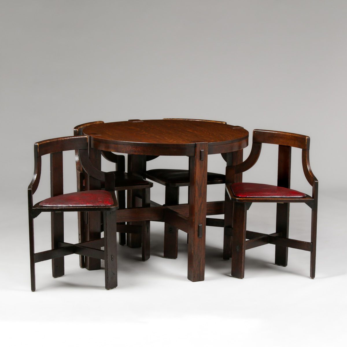 Grand Rapids Oak Game Table & Chairs c1910. Unsigned. Table top refinished perfectly to match excellent original finish. Table and chairs go nicely together but they are not original to each other. Chairs are very sturdy and have their original finish. 29"h x 36"d chairs: 29.5"h x 25"w x 17"d