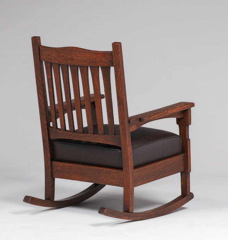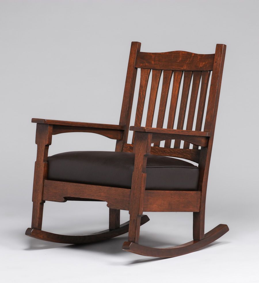 Early Gustav Stickley #2555 Bungalow Rocker c1900. Unsigned. Beautifully replaced rockers. Very nicely refinished. 37.5"h x 27.5"w x 30.75"d $5500