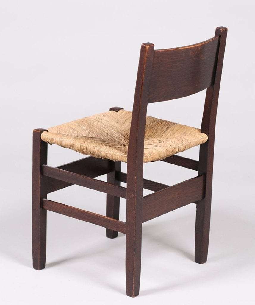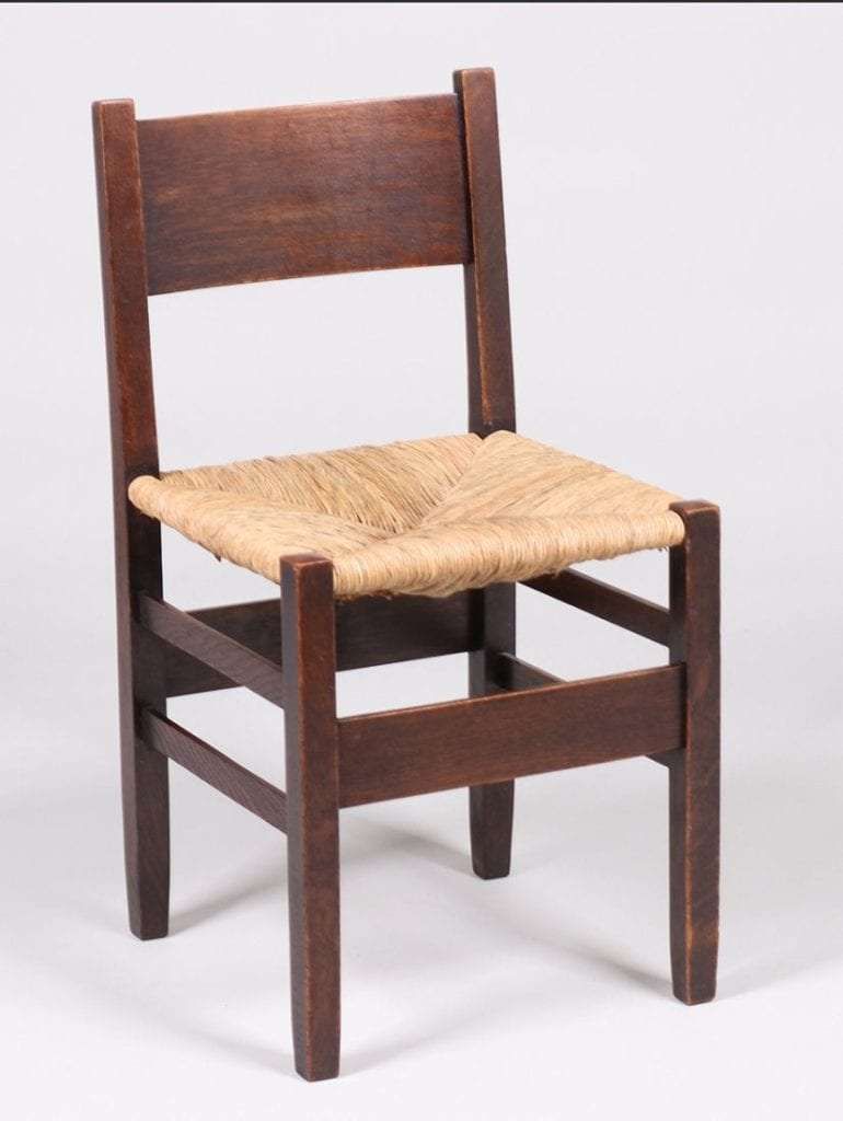 Early Gustav Stickley #2578 Chalet Desk Chair c1902. Signed with early red decal. Excellent original finish. New rush seat. Very sturdy SOLD