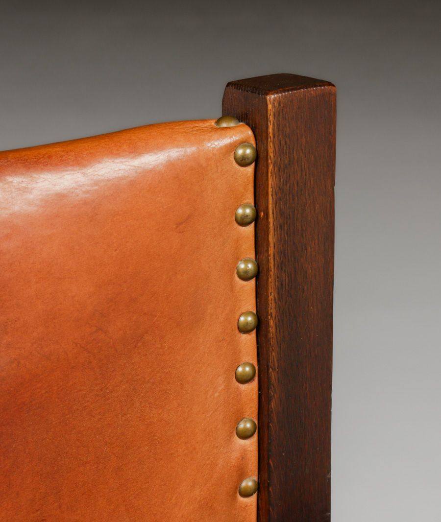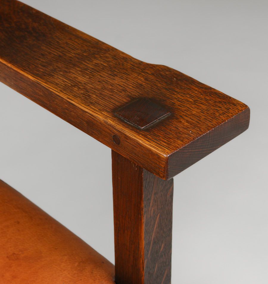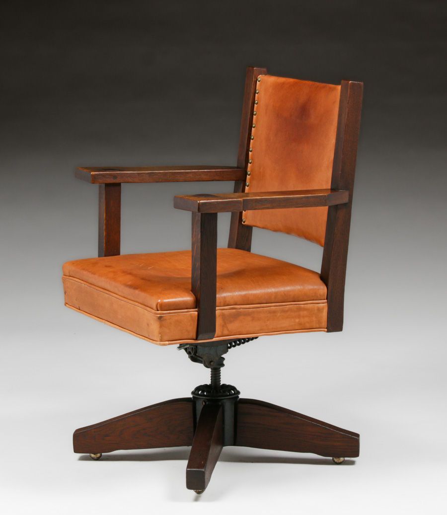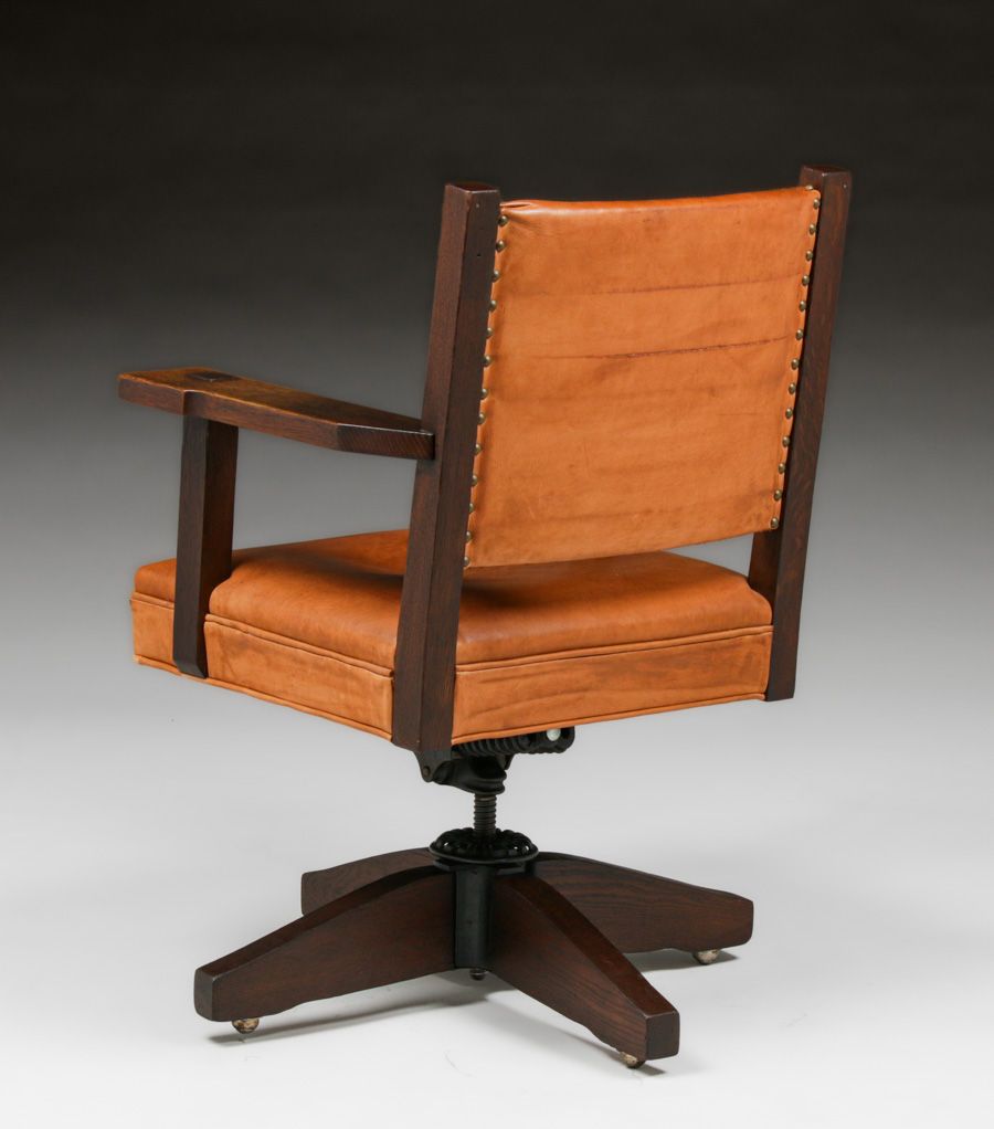 Early Gustav Stickley #2684 1/2 Oak Swivel Chair c1902. Unsigned. Very nice old refinish. 40 year old replaced leather has worn in very well. Original mechanism is strong and works perfectly. 36.5"h x 27"w x 21"d
