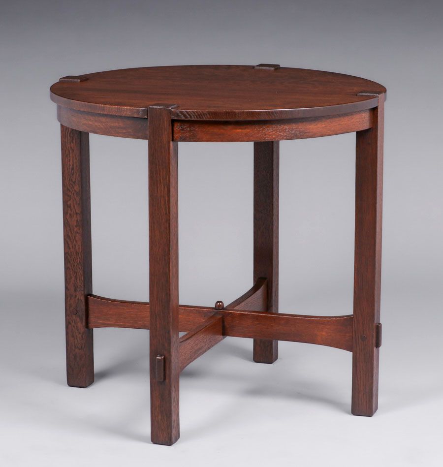 Early Gustav Stickley #439 Lamp Table c1902. Unsigned. Very nicely refinished. 26″d x 25.5″h SOLD
