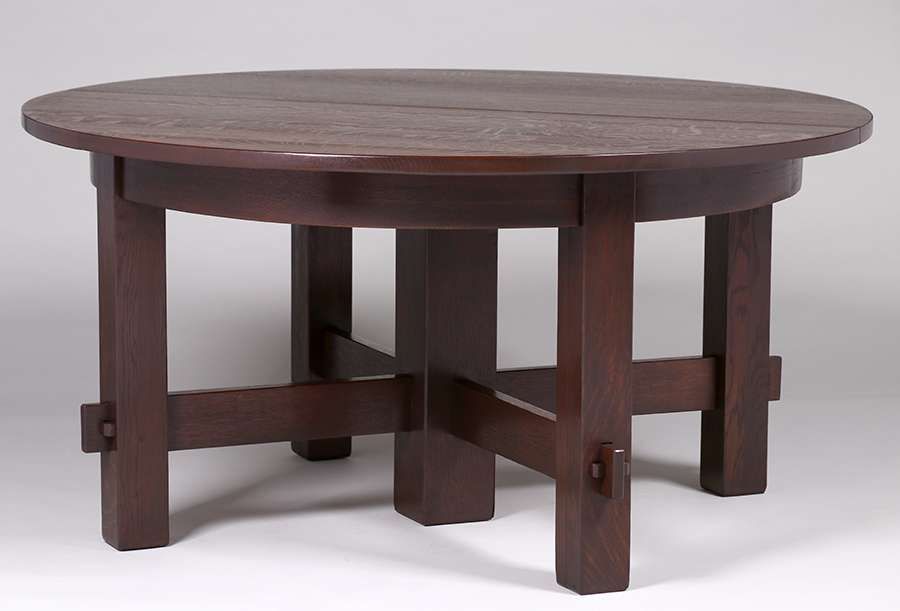 Early Gustav Stickley 60" five-leg dining table c1902 with seven 11.5"w skirted leaves. Four original leaves + three new leaves. Unsigned. Very nicely refinished. 60"d x 29.75"h (extends to 60" x 140.5") SOLD