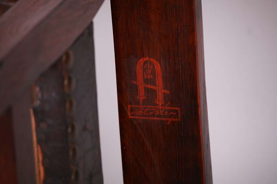 Early Gustav Stickley Armchair #2639 with Original Leather Back and Seat. Excellent original finish. Signed with large early red decal c1901-1902. 36.5"h x 26"w x 20"d SOLD