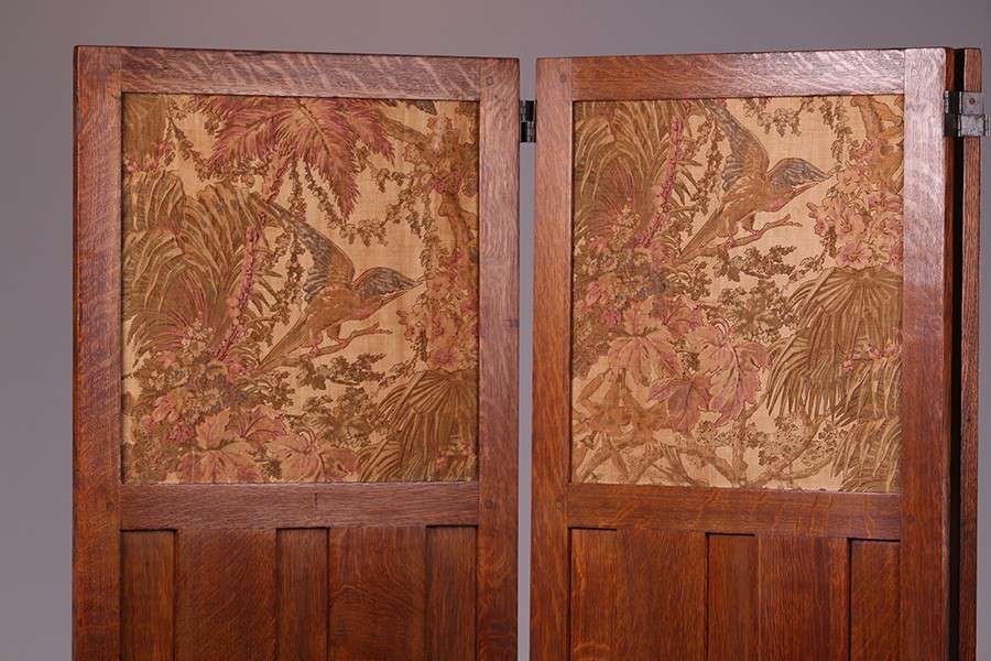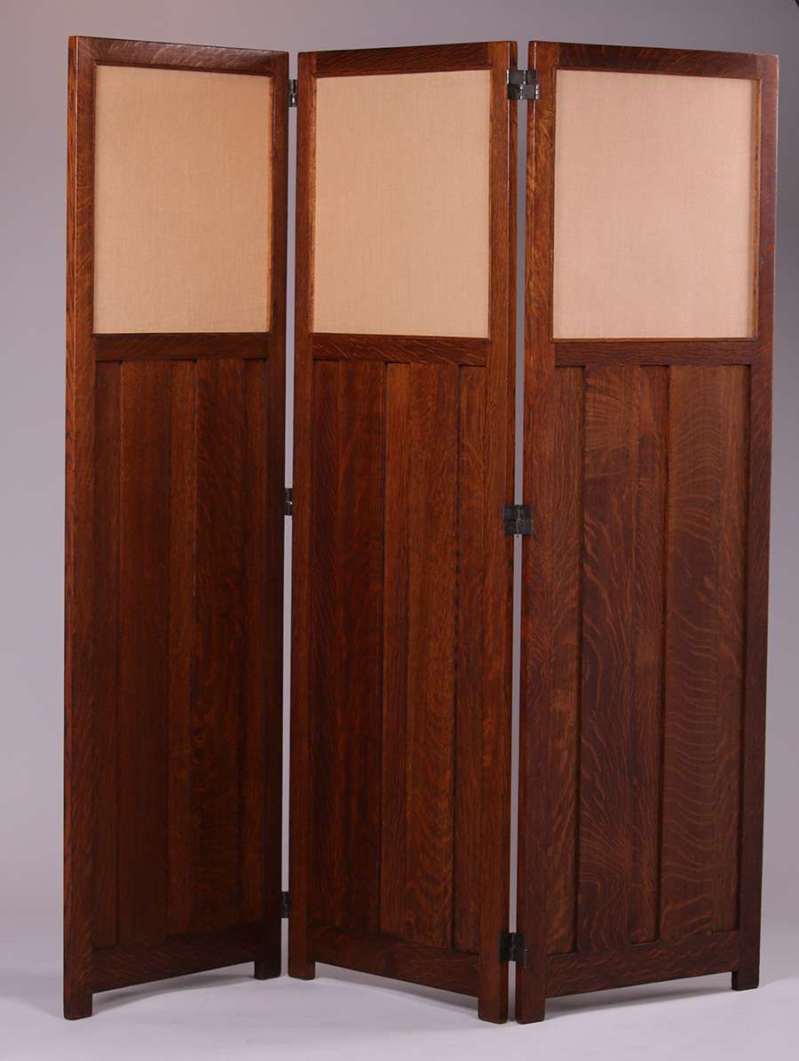 Gustav Stickley 3-Panel Screen #91. From the collection of Robert Judson Clark who sold it to Robert & Elaine Dillof. Original finish. Signed. Liberty & Co fabric installed by Mr Clark in the 1960s or 70s. Each panel measures 68.5"h x 22"w. SOLD