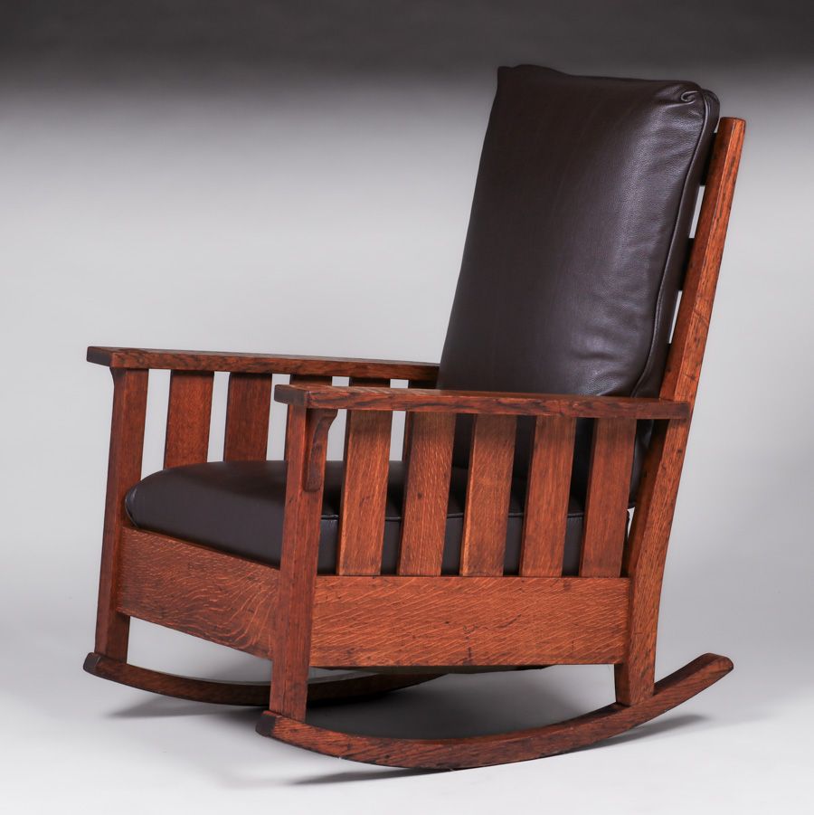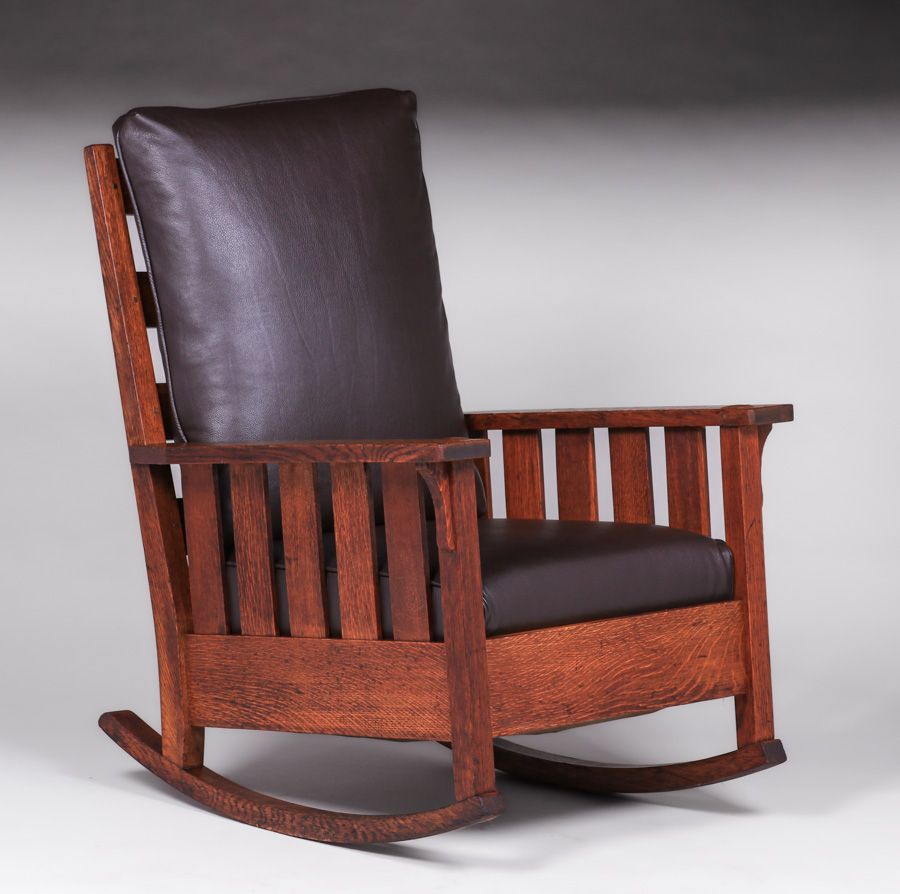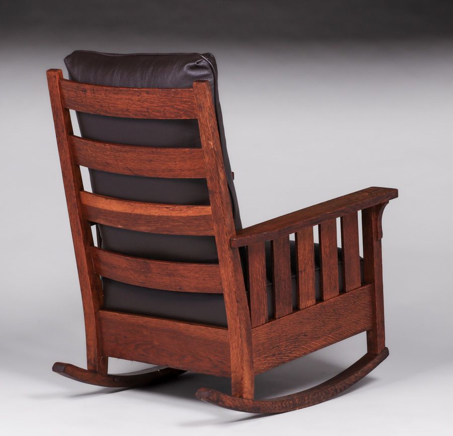 Gustav Stickley #323 Slatted Rocker c1910. Unsigned. Excellent original finish. 42″h x 29″w x 34″d SOLD