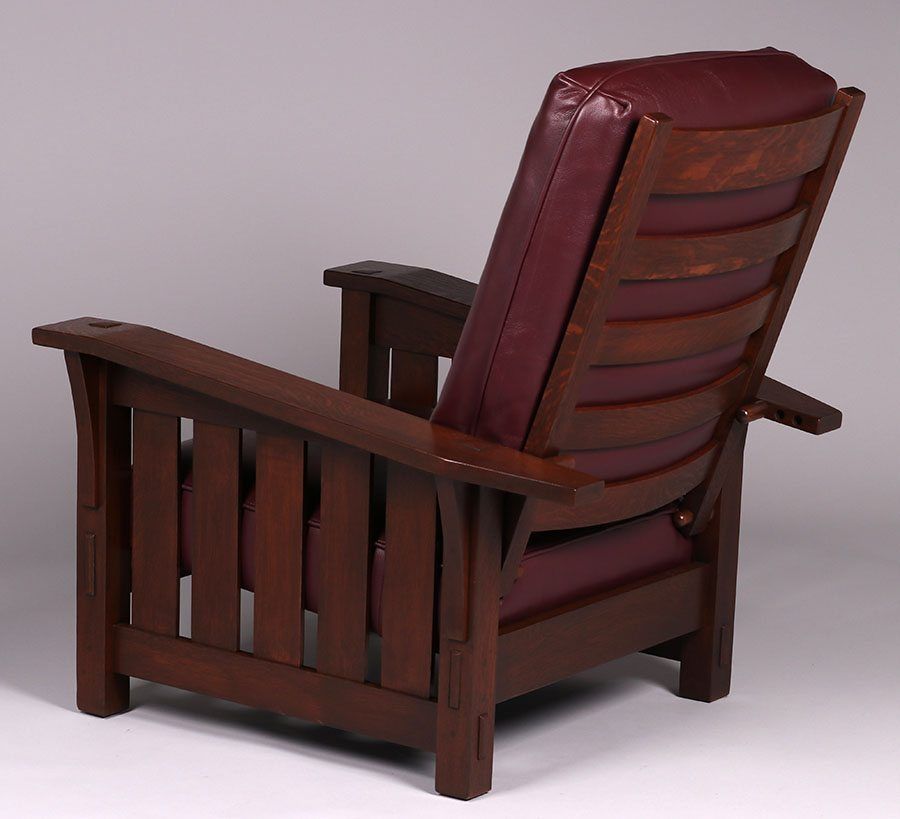Gustav Stickley #369 bentarm slatted morris chair. Unsigned. Very nicely refinished. 42"h x 32.75"w x 38"d SOLD