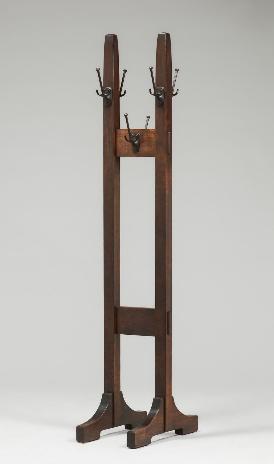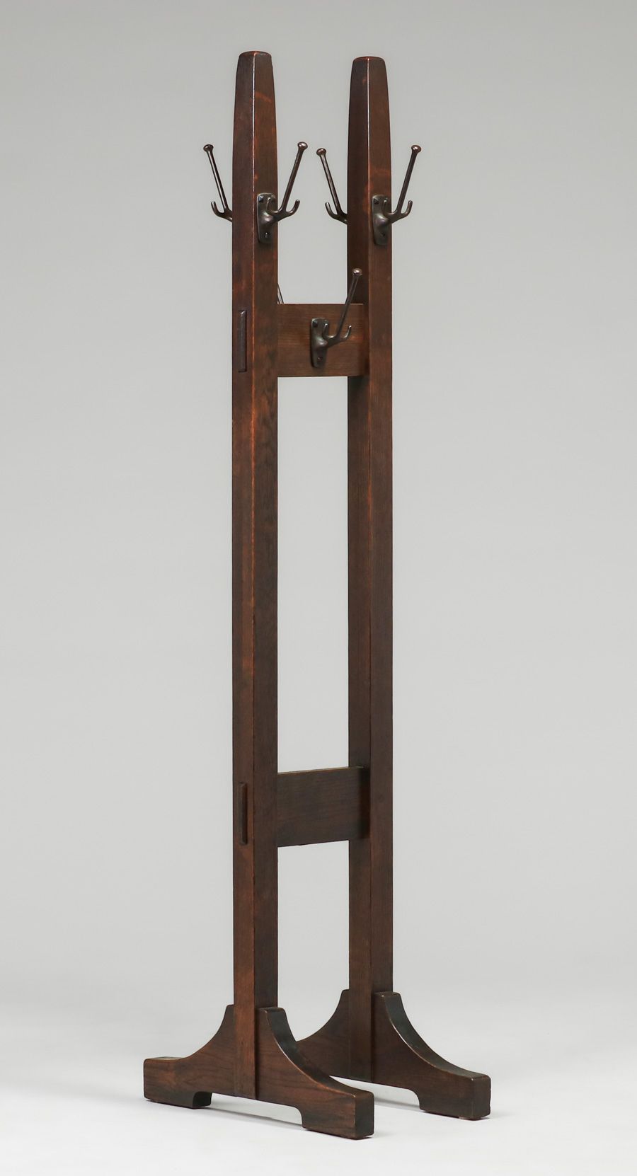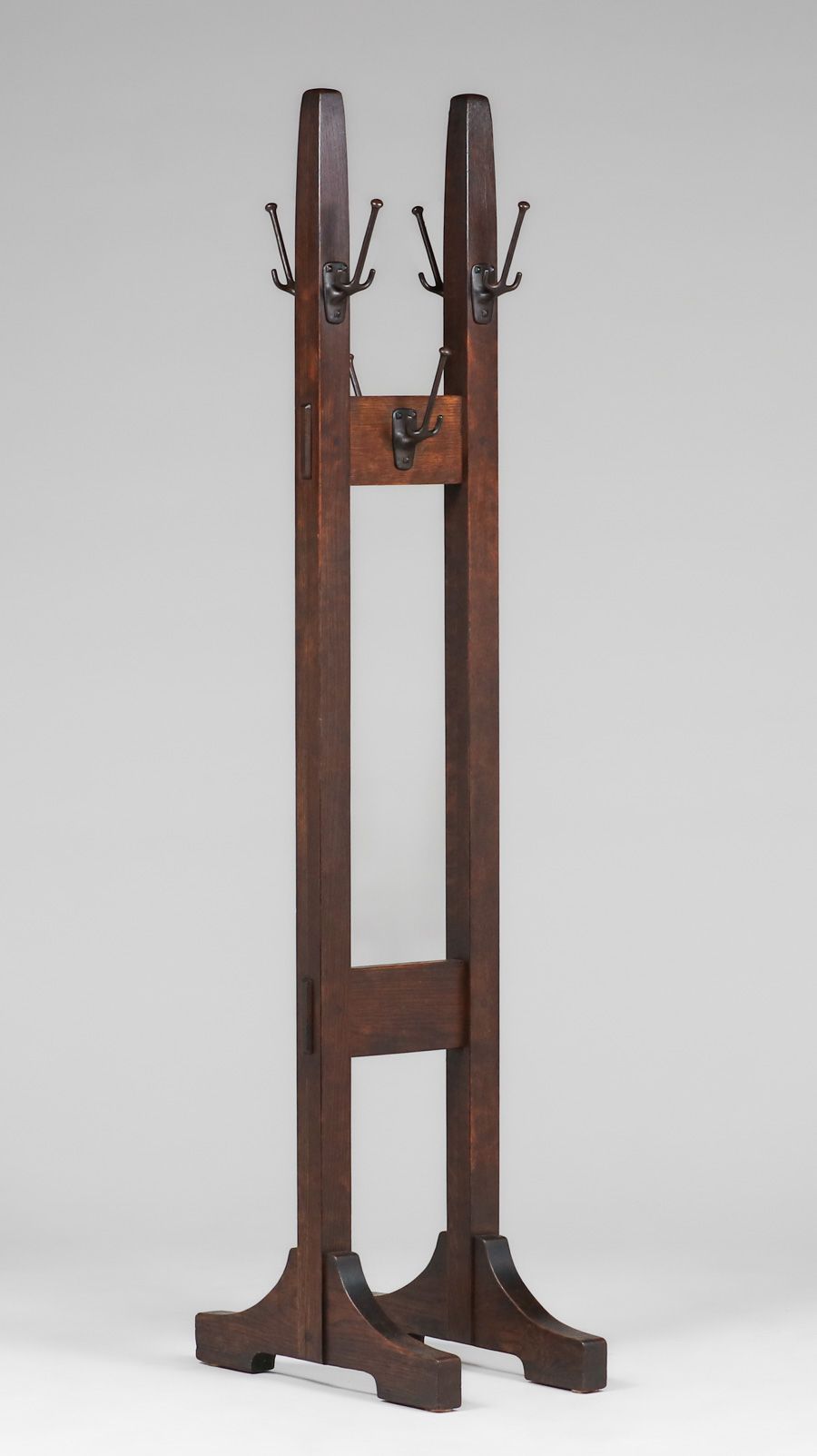 Gustav Stickley #53 Double Costumer (Coatrack) c1910. Unsigned. Excellent original finish. 72"h x 13.25"w x 22" SOLD