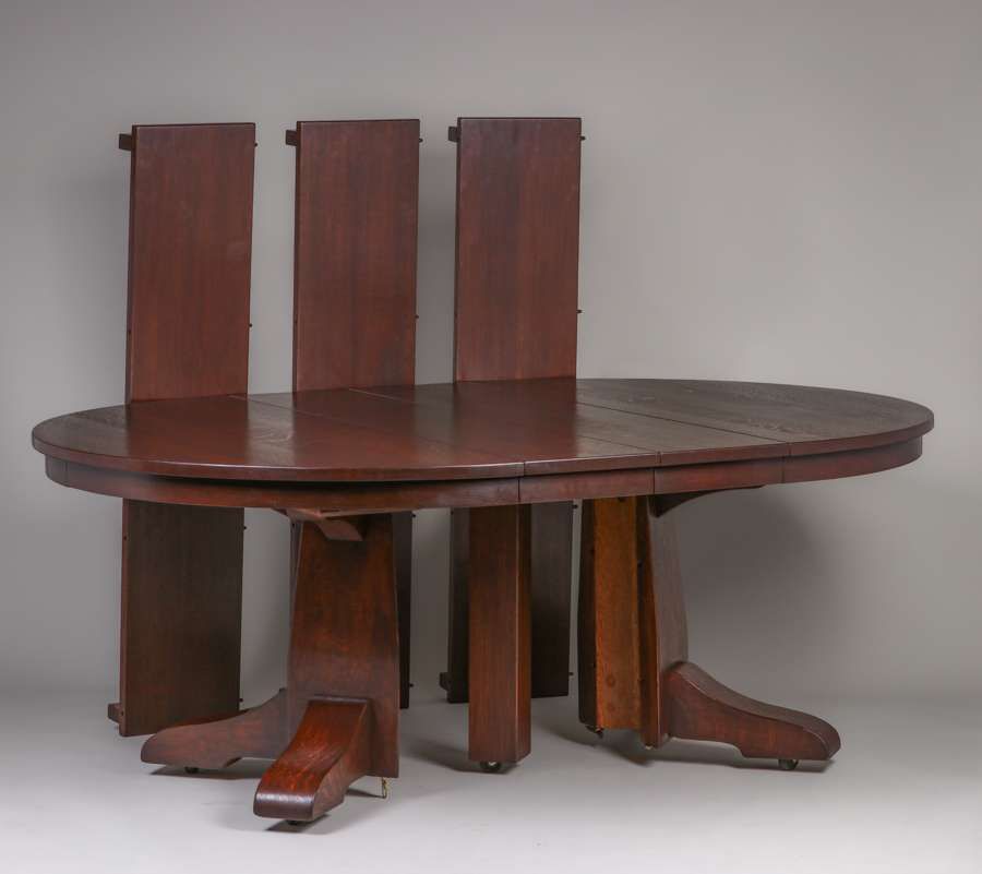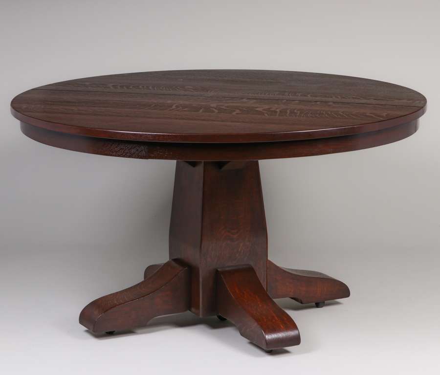 Gustav Stickley 54" Dining Table c1910. Signed with red decal. Very nicely refinished. Five new skirted leaves. 54"d x 30"h (extends to 109" x 54") SOLD