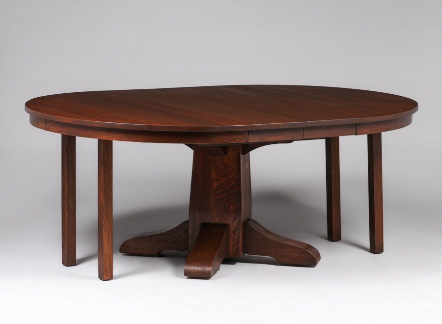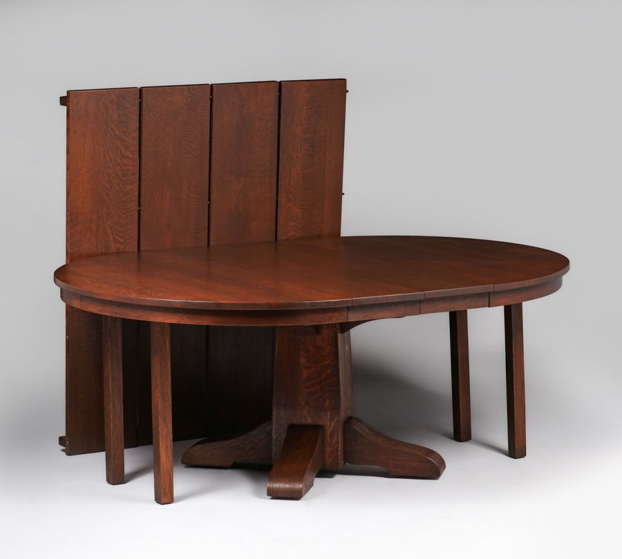 Gustav Stickley 54"d Pedestal Dining Table c1910. Six new custom 11.5"w skirted leaves. Unsigned. Very nicely refinished. 54"d x 30"h $7500