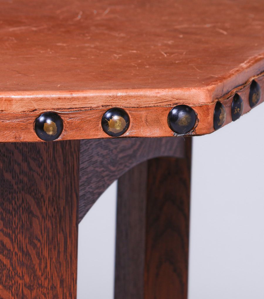 Gustav Stickley #625 Hexagonal Table c1905. Signed. Color added to original finish. Very nicely replaced leather on top. Rock solid sturdy. 48″ x 48″ x 29.25″h SOLD