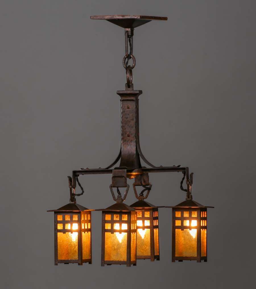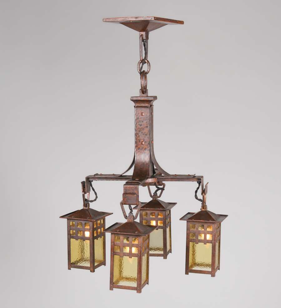 Gustav Stickley #730 Hammered Copper Chandelier c1910. Signed. Excellent original patina and original amber glass. 34.75"h x 22" x 22" SOLD
