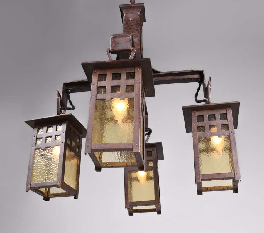 - Gustav Stickley #730 Hammered Copper Chandelier c1910