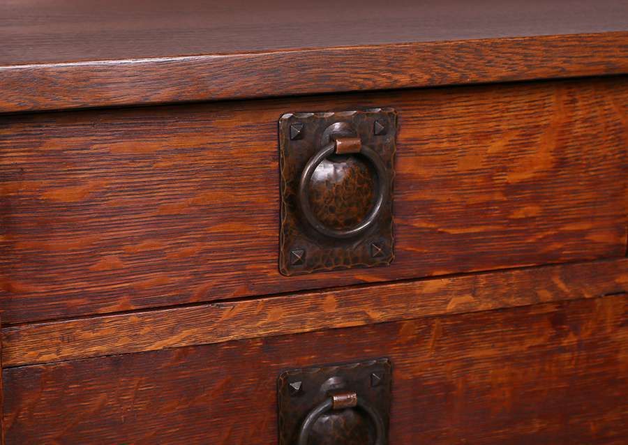 Gustav Stickley chest of drawers with fantastic hammered copper hardware. Signed. Excellent original finish. Top refinished. Two small barrel locks added to two drawers. 48"h x 40.5"w x 20.5"d SOLD