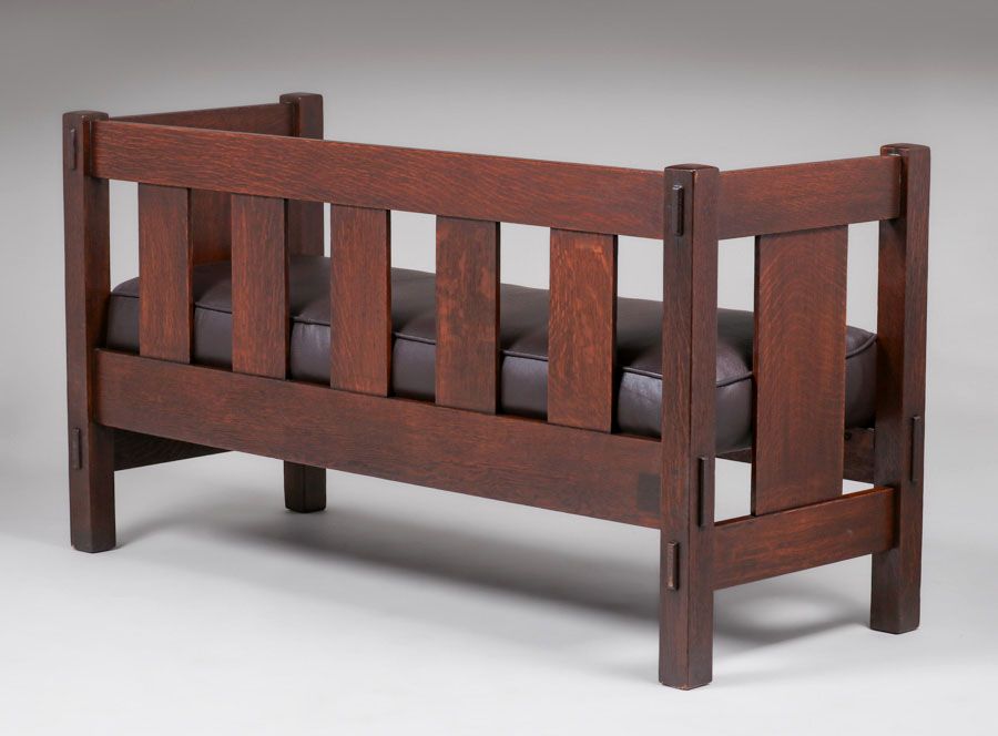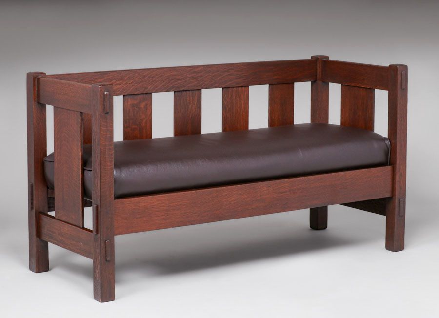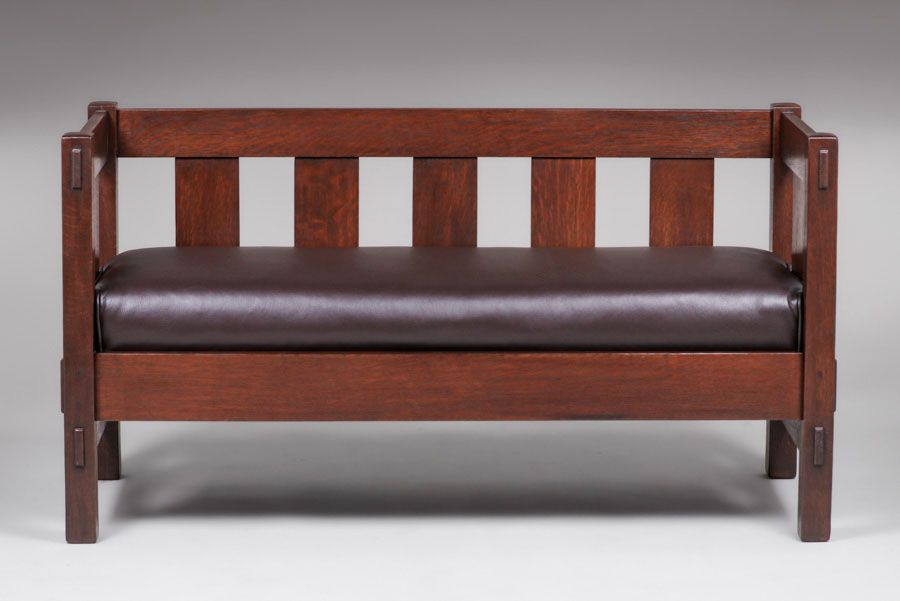 Gustav Stickley Evenarm Hall Settle c1910. Signed with remnant of red decal. Very nicely refinished. 55.5”w x 30”h x 22”d SOLD