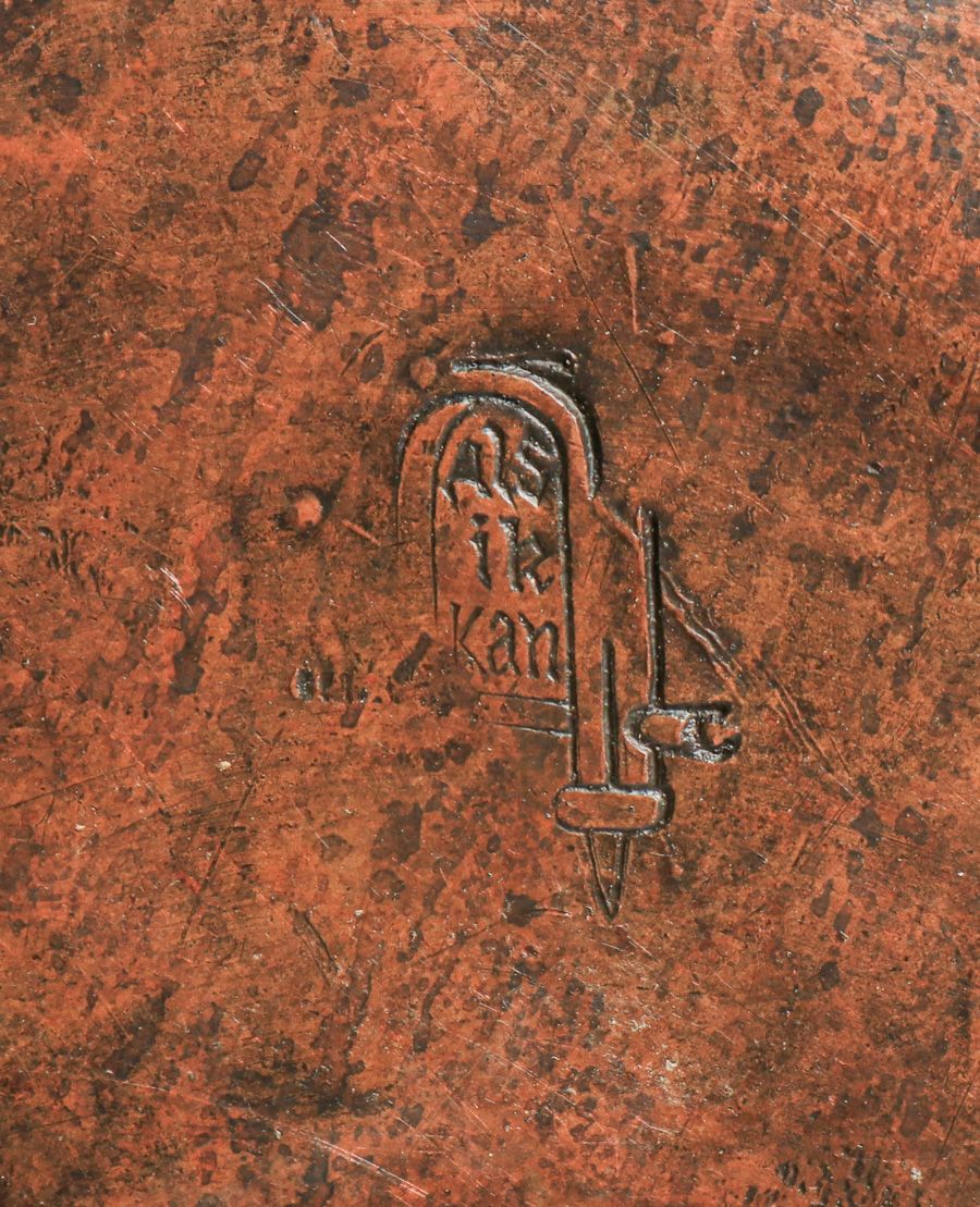 Gustav Stickley Hammered Copper Chamber Stick c1910. Signed. Color added to original patina. 9"h x 7"d SOLD