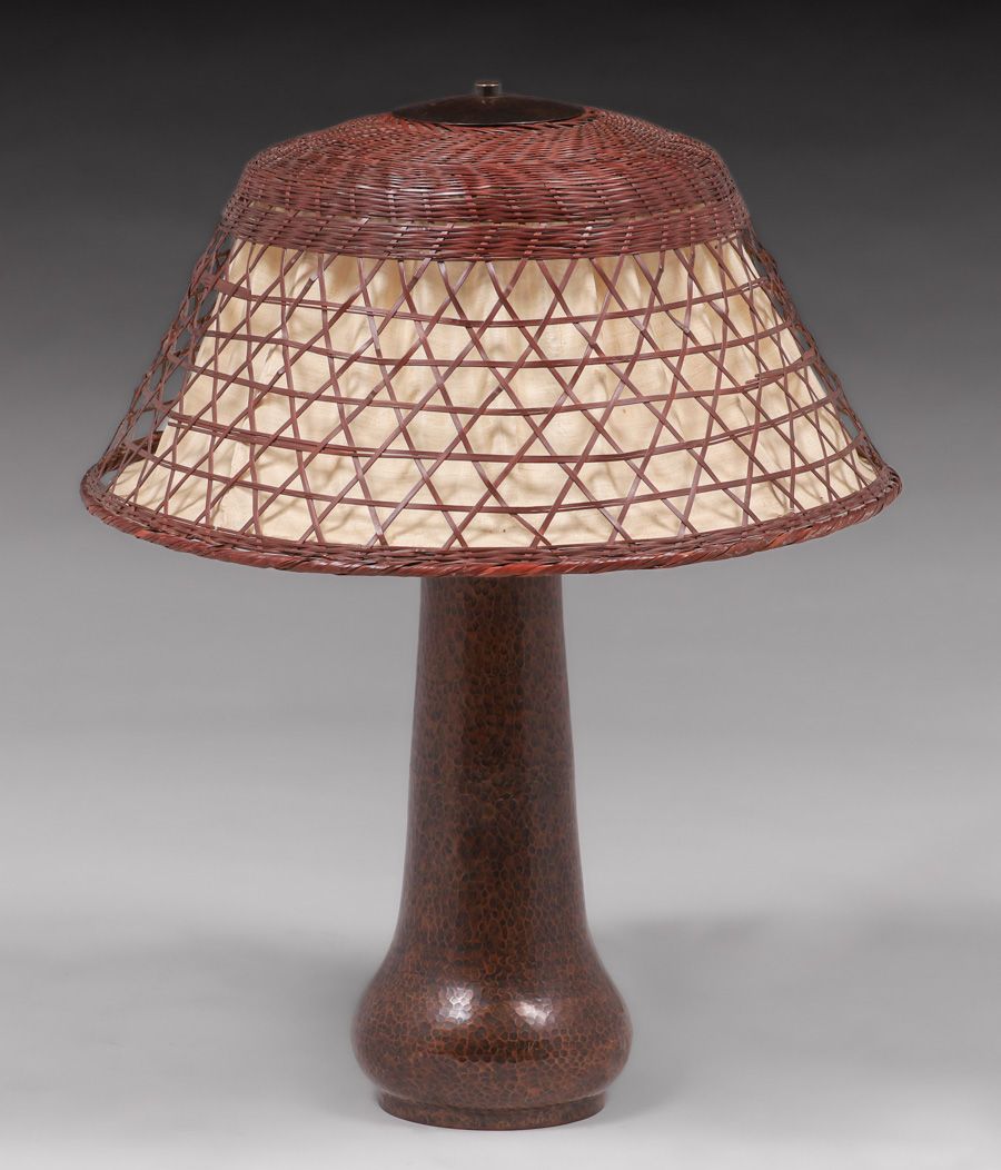 - Gustav Stickley Hammered Copper & Japanese Wicker Shade c1910