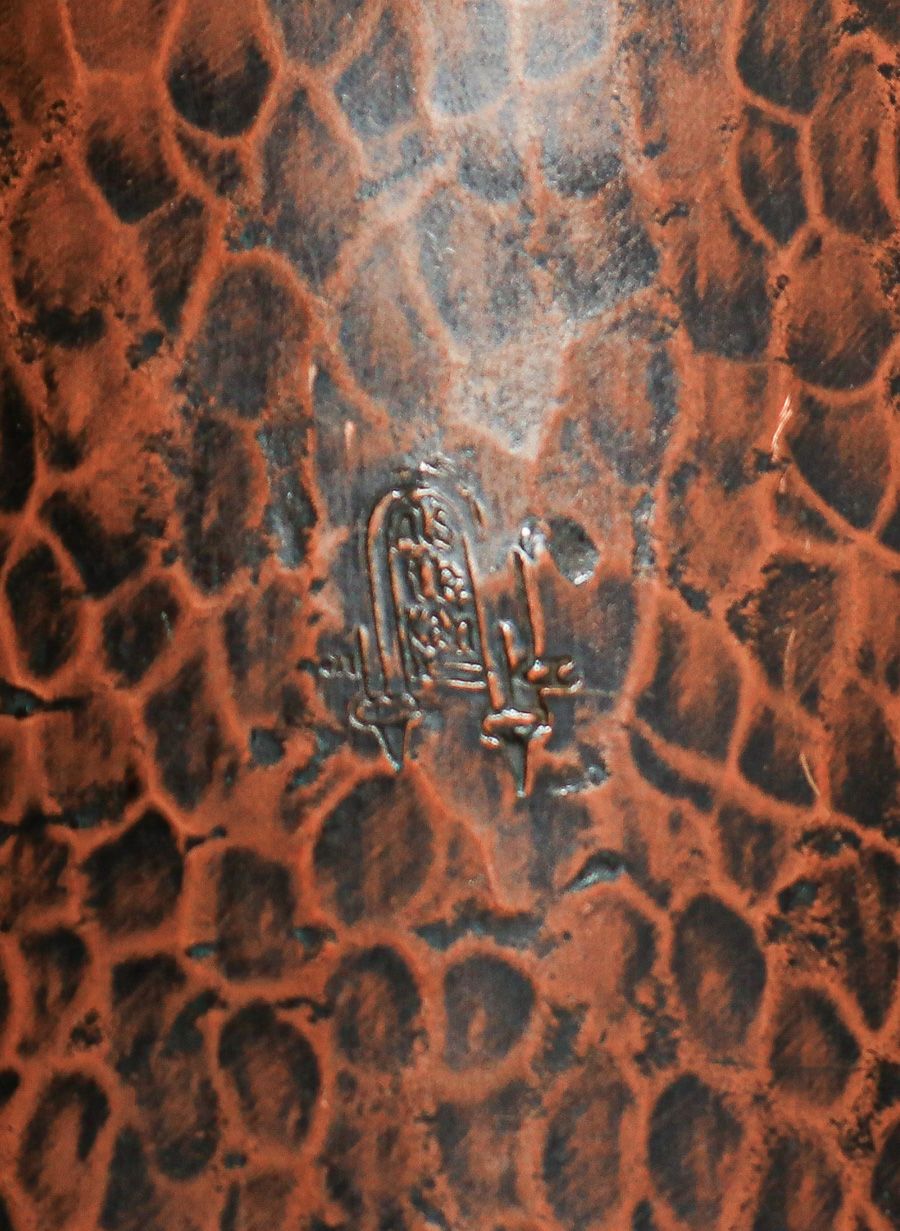 Gustav Stickley Hammered Copper & Japanese Wicker Shade c1910. Signed. A couple of minor breaks to wicker. Finial not original. Excellent original patina. 25.5"h x 20"d SOLD