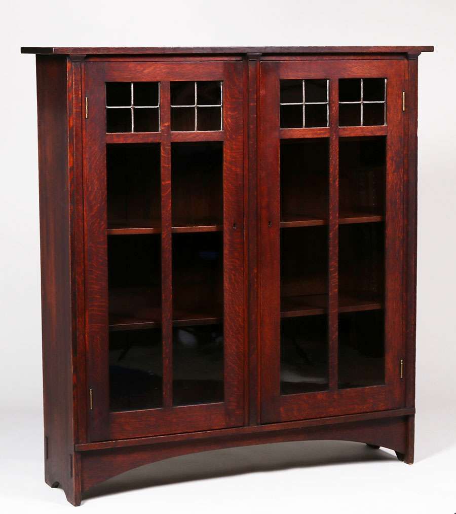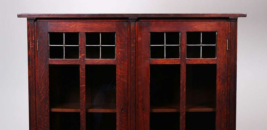 Gustav Stickley - Harvey Ellis designed two-door bookcase with original leaded glass squares at top of doors c1904-1905. Signed. Excellent original finish. 58"h x 53.75"w x 14"d SOLD