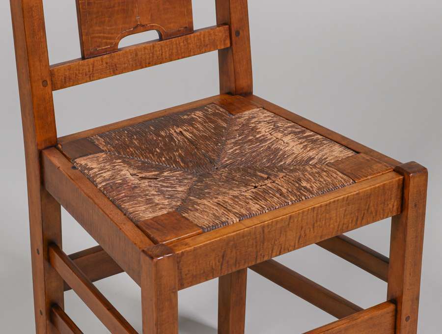 Gustav Stickley - Harvey Ellis Inlaid Maple Side Chair c1912. Although Ellis died in 1904, this chair shows his phenomenal influence. Unsigned. Color added to original finish. Very sturdy. Original rush seat. 40.25"h x 14"w x 15.75"d SOLD