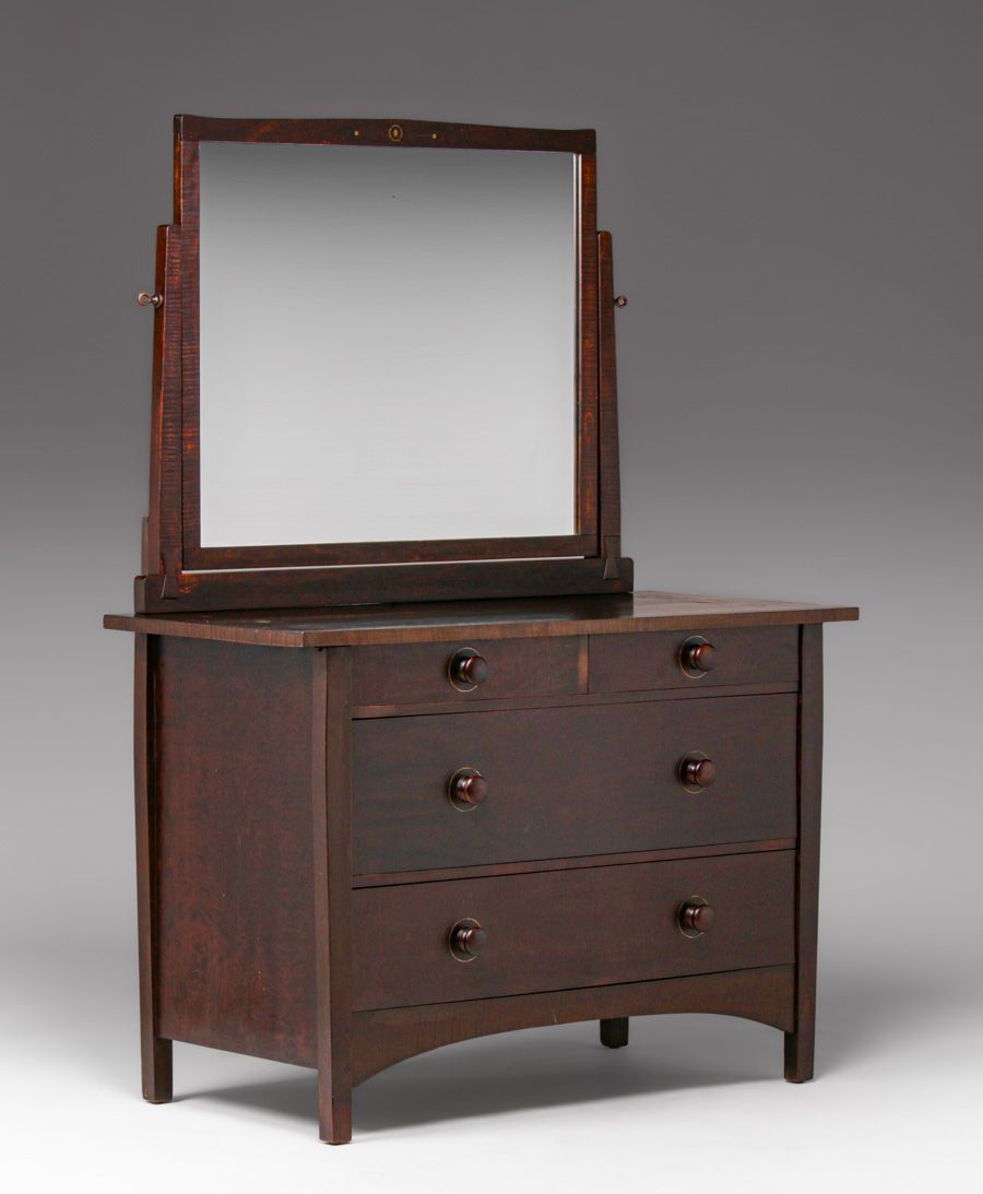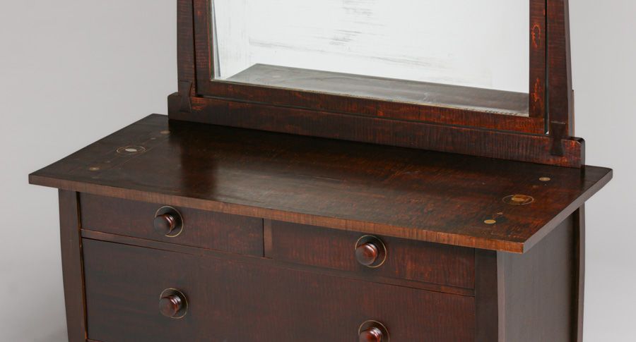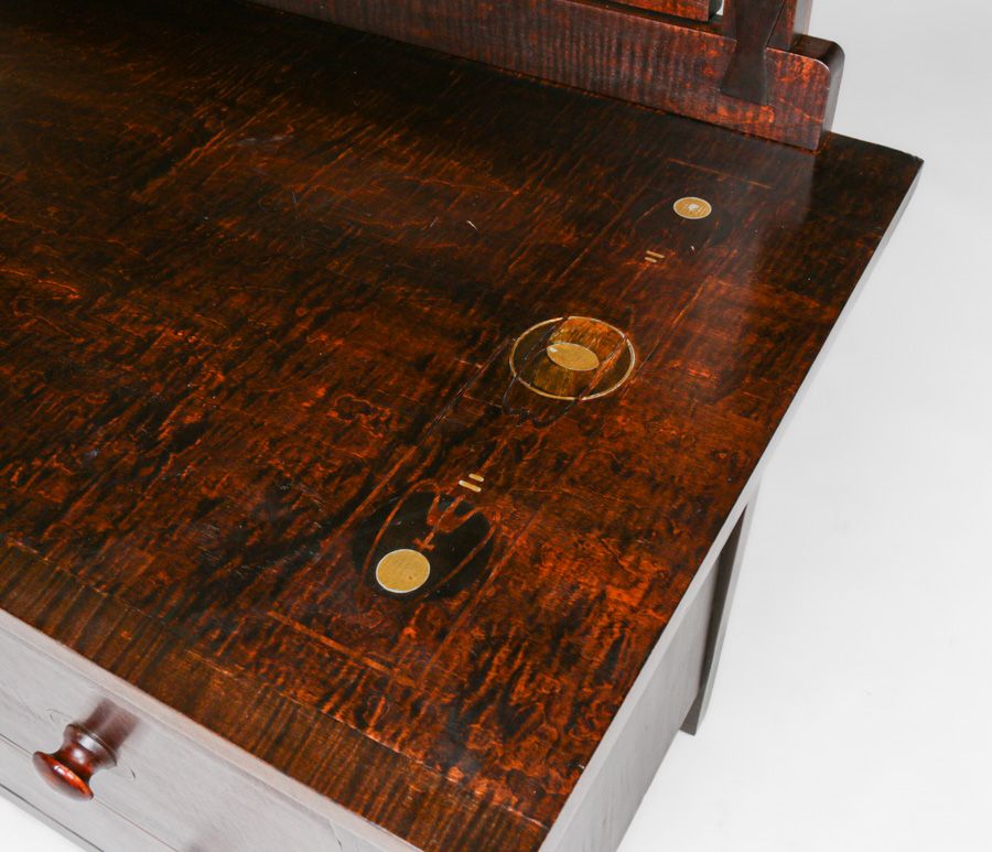 Gustav Stickley - Harvey Ellis Maple Inlaid Dresser with Mirror c1904. Signed. Color added to original finish. Nearly invisible professional conservation to areas of veneer and inlay. 66.5"h (32"h to top surface) x 48.25"w x 22"d