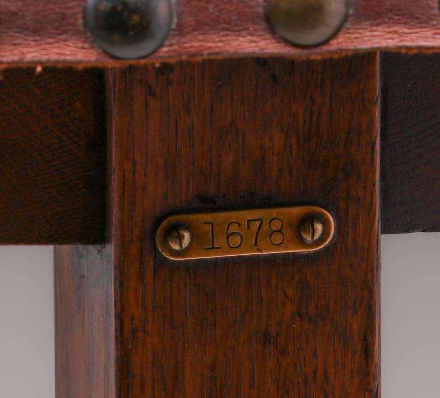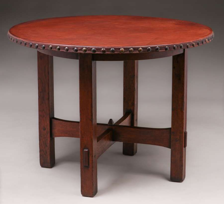 Gustav Stickley Leather-Top Lamp Table c1902. Unsigned. Excellent original finish. Very nicely replaced leather top. 40"d x 30"h SOLD