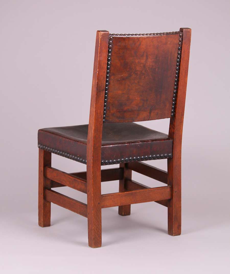 Gustav Stickley leatherback side chair. Signed. Excellent original finish and original leather to seat and back. 36.5"h x 19"w x 18"d SOLD
