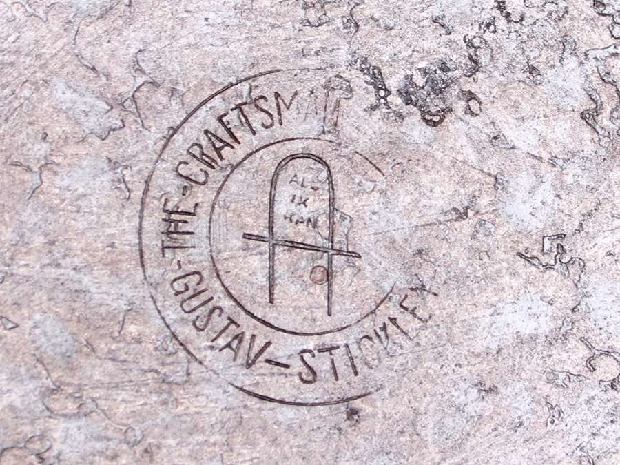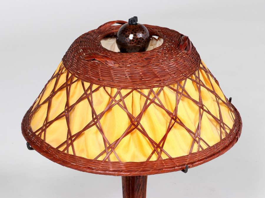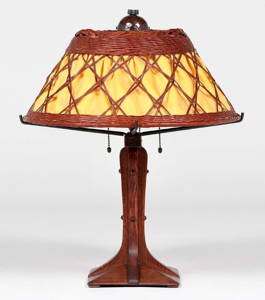 - Gustav Stickley Oak & Japanese Wicker Lamp c1910