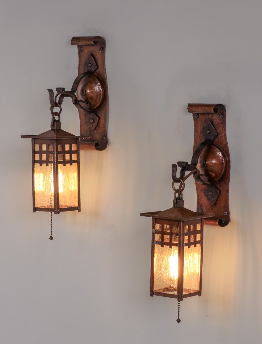 - Gustav Stickley Pair Hammered Copper & Amber Glass Lanterns c1905