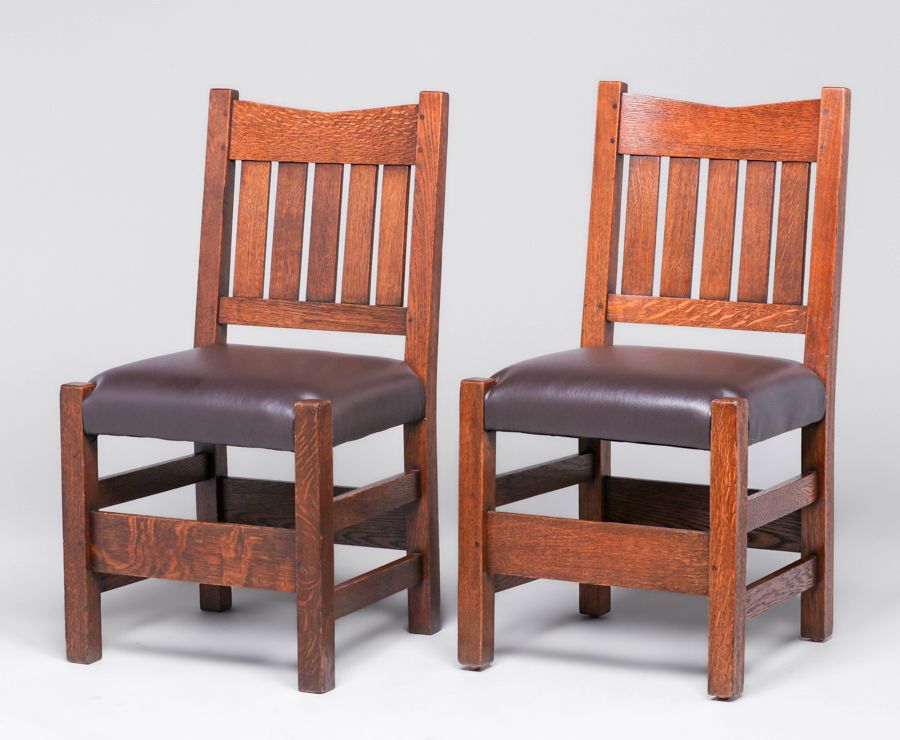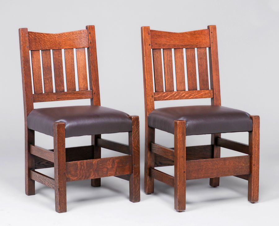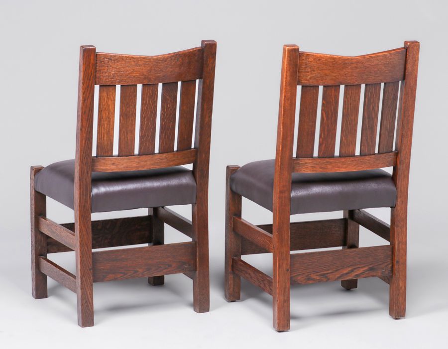 - Gustav Stickley Pair V-Back Side Chairs c1905