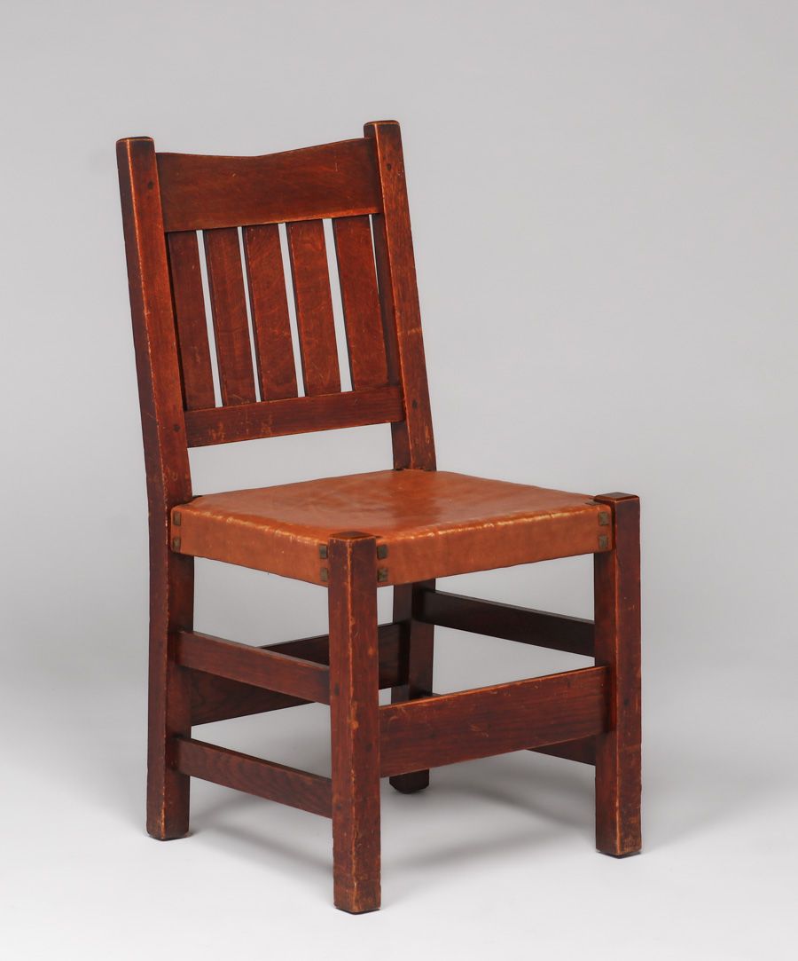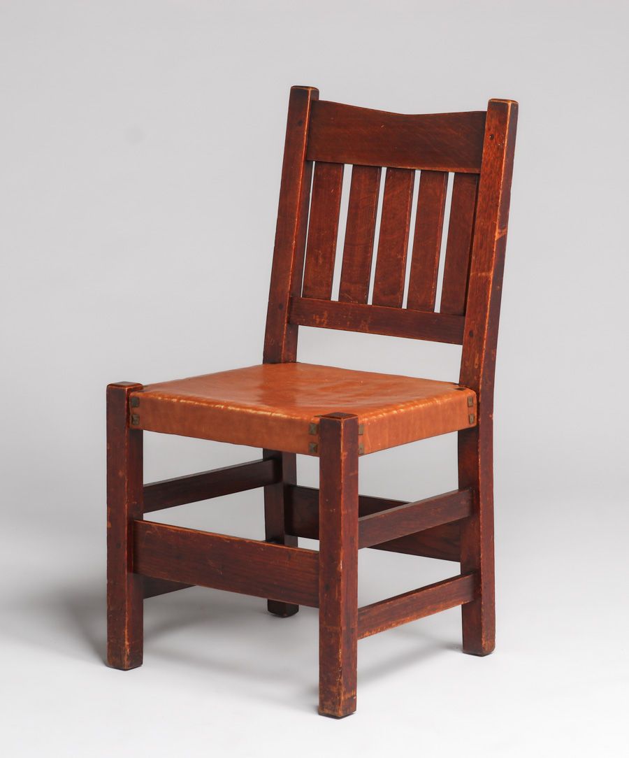 Gustav Stickley Set of 4 V-Back Side Chairs c1910. Signed. Excellent original finish. Slightly worn 30+ year old leather looks original. Rock solid sturdy. 36.5"h x 18.5"w x 17"d SOLD