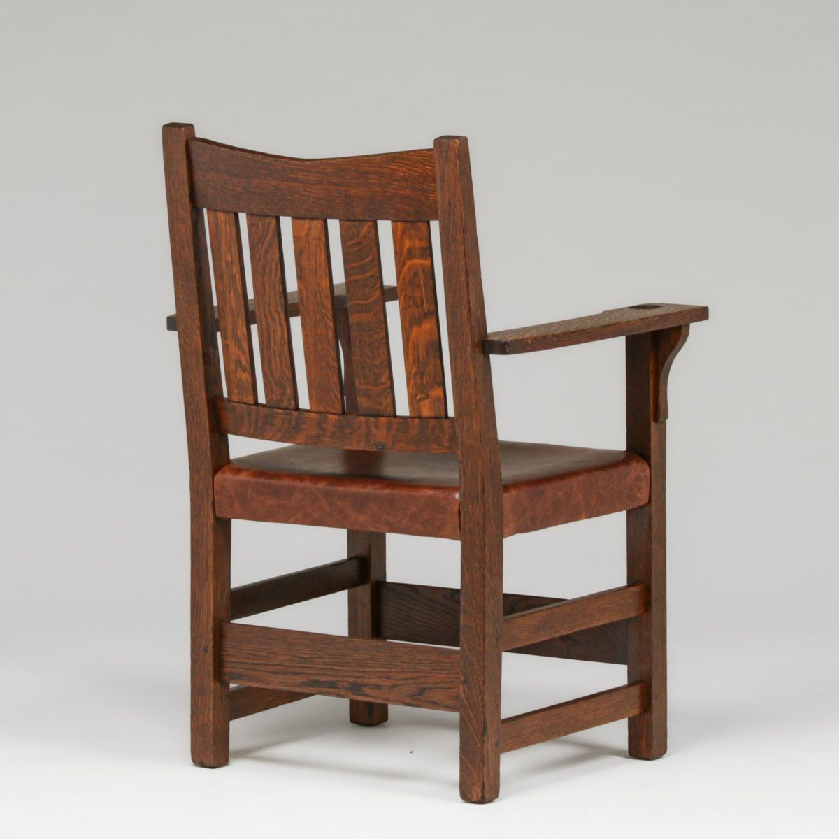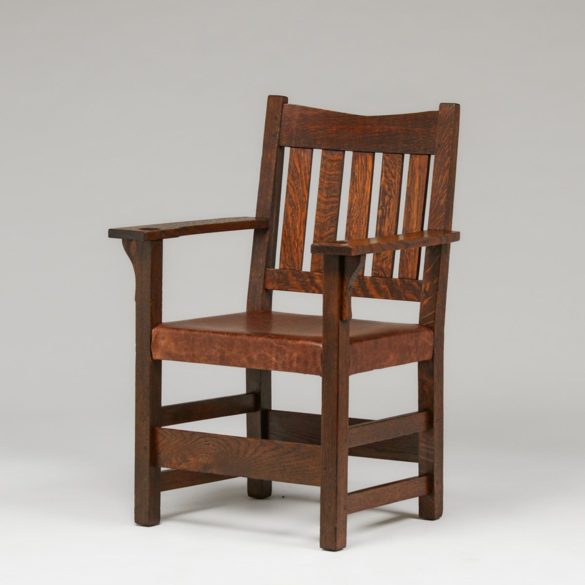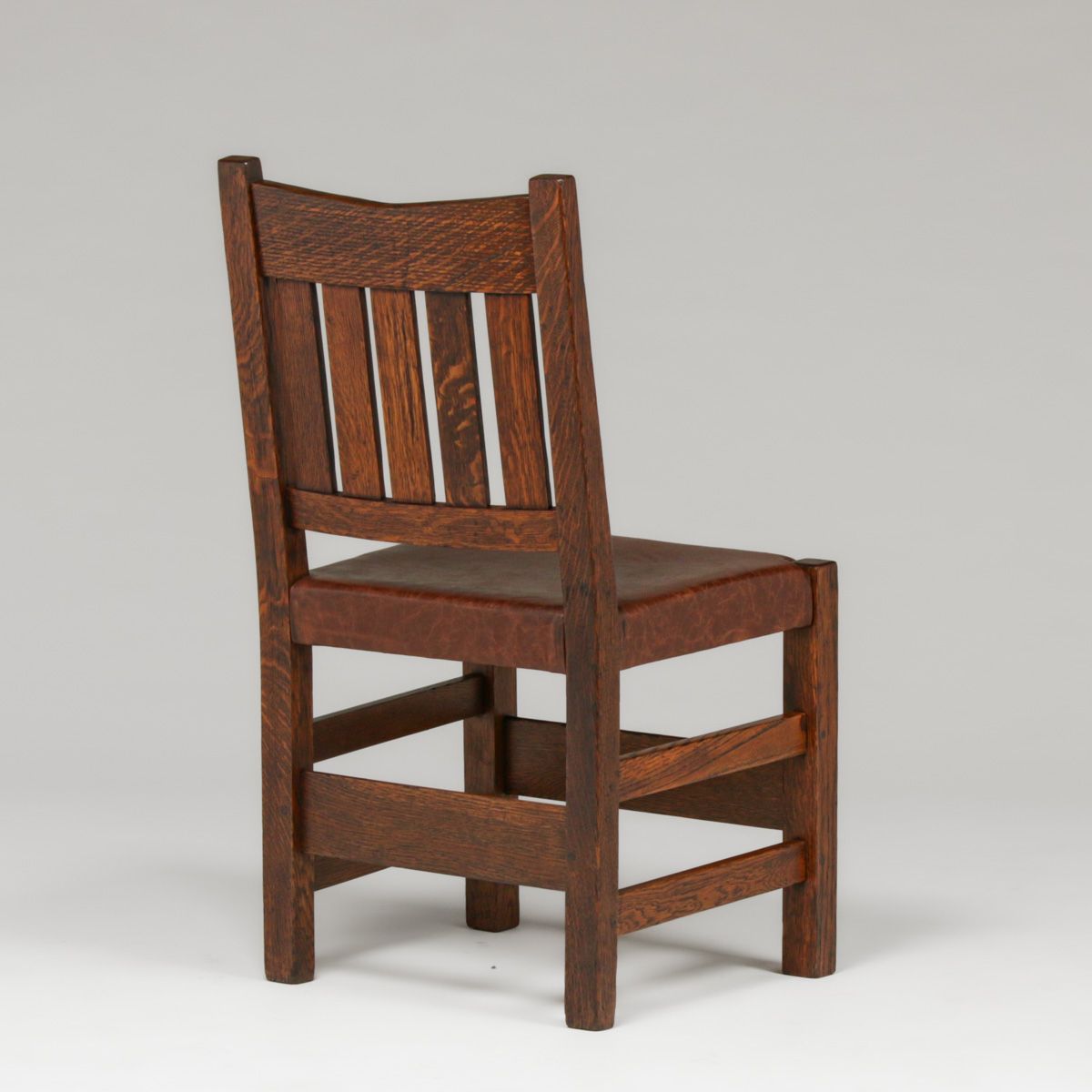Gustav Stickley Set of 6 V-Back Dining Chairs c1910. One armchair and five side chairs. Signed. Excellent original finish. Rock solid sturdy. Arm Chair: 37”h x 25.75”w x 21”d Side Chairs: 35.25”h x 19”w x 19.5”d